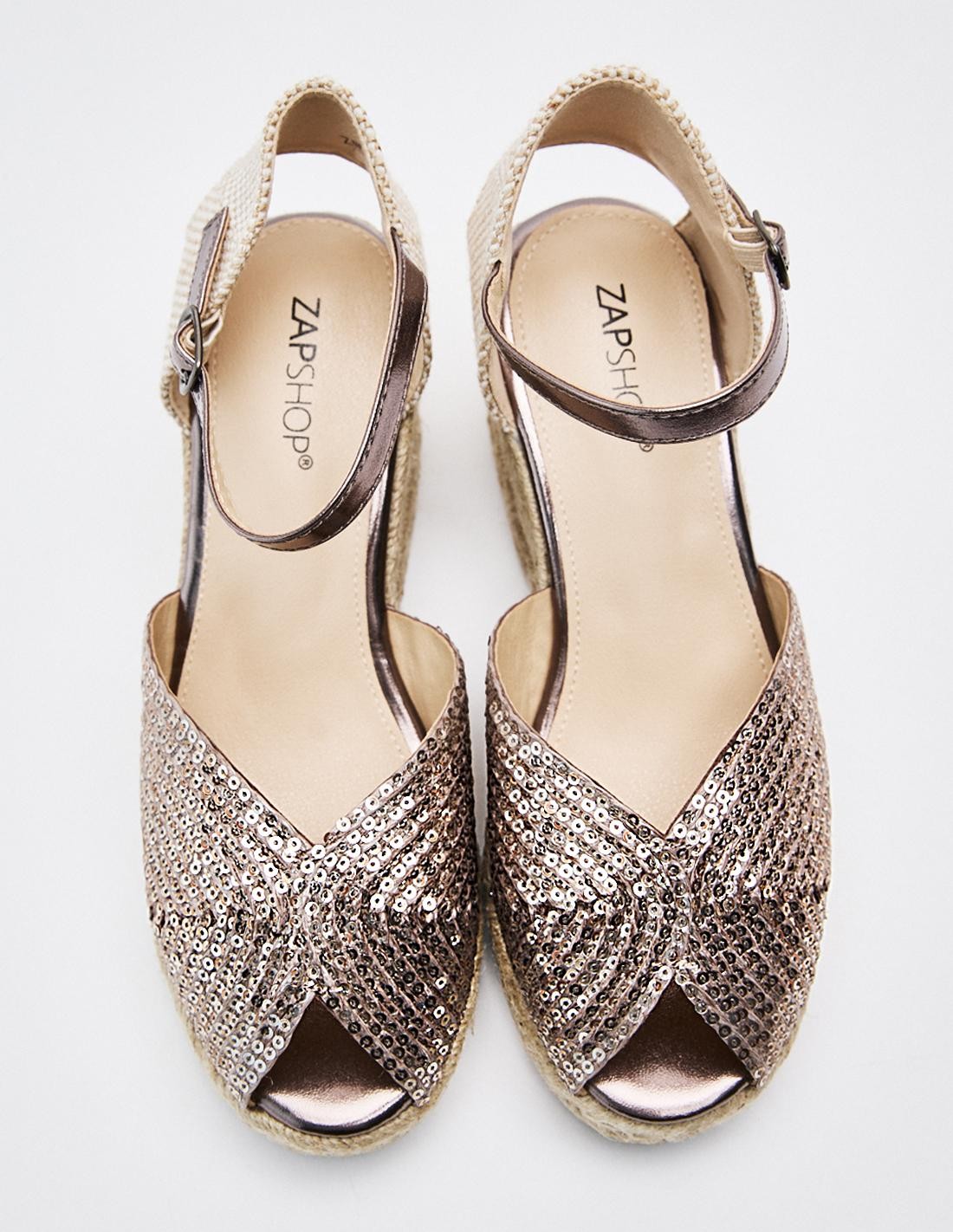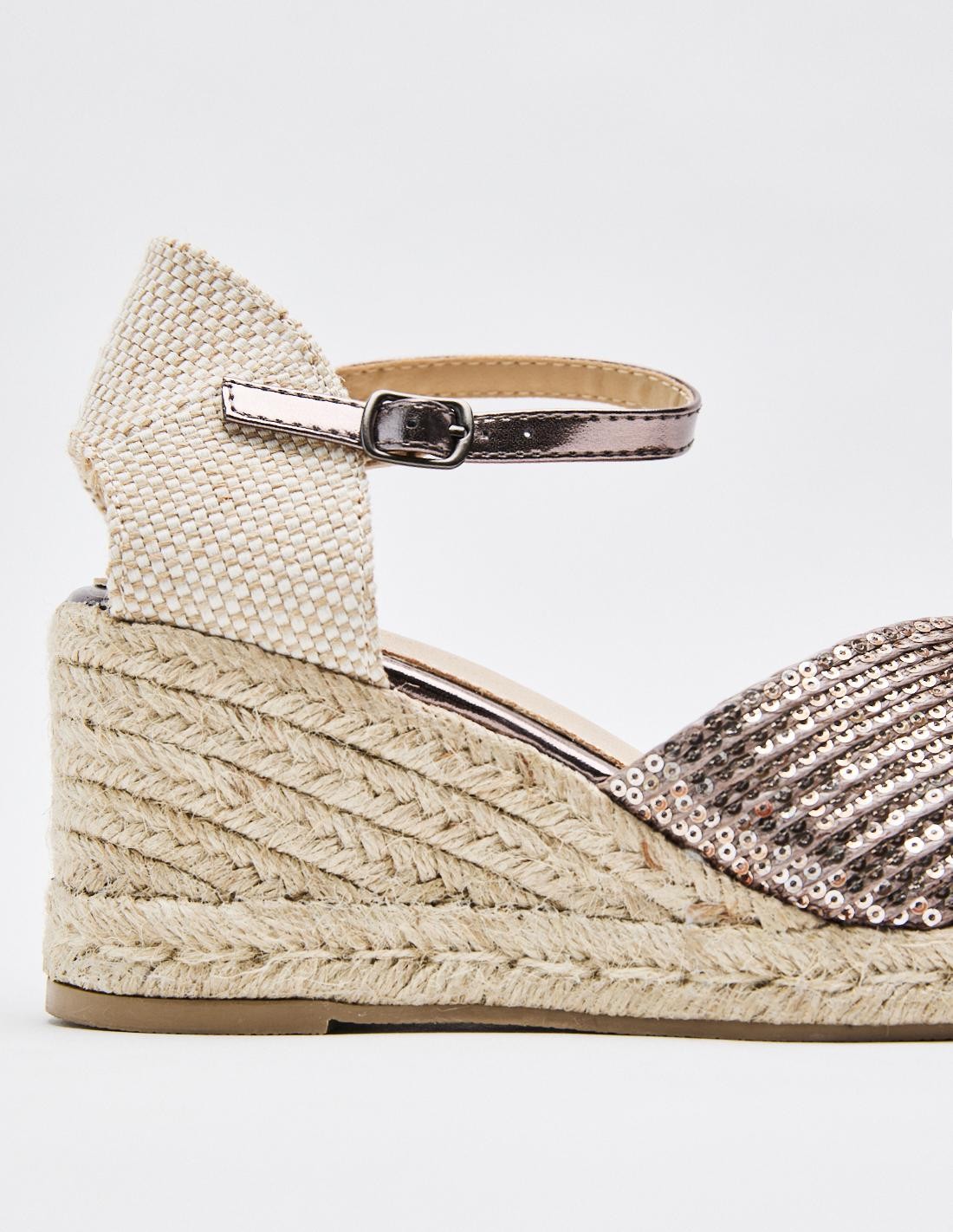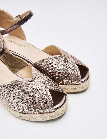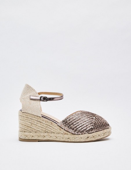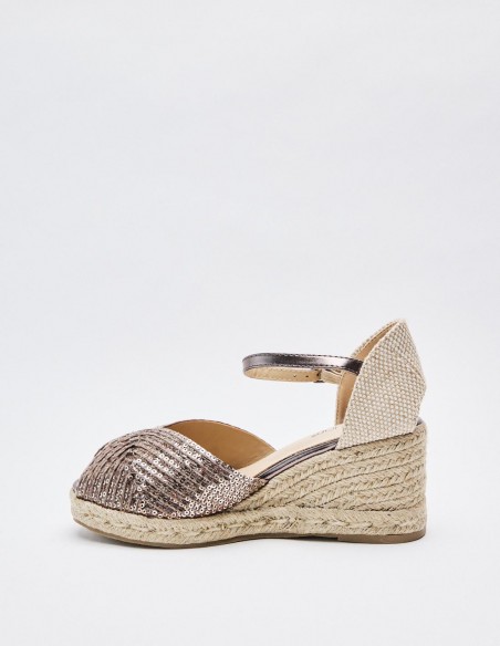 Zapato destalonado tipo alpargata en efecto tejido metalizado . Tacón alto en forma de cuña. Cierre mediante pulsera con hebilla en el tobillo. Suela de goma con yute . Altura del tacón: 10 cm