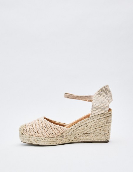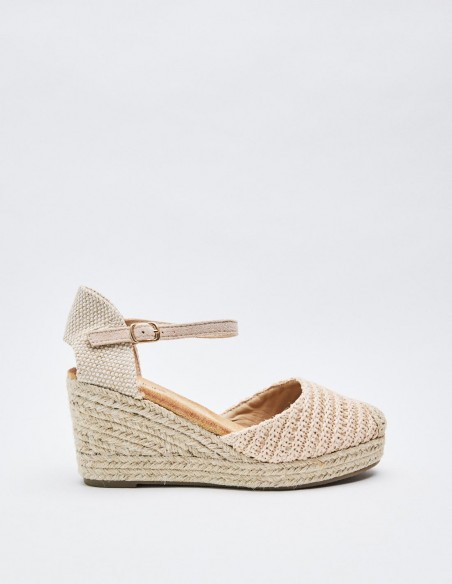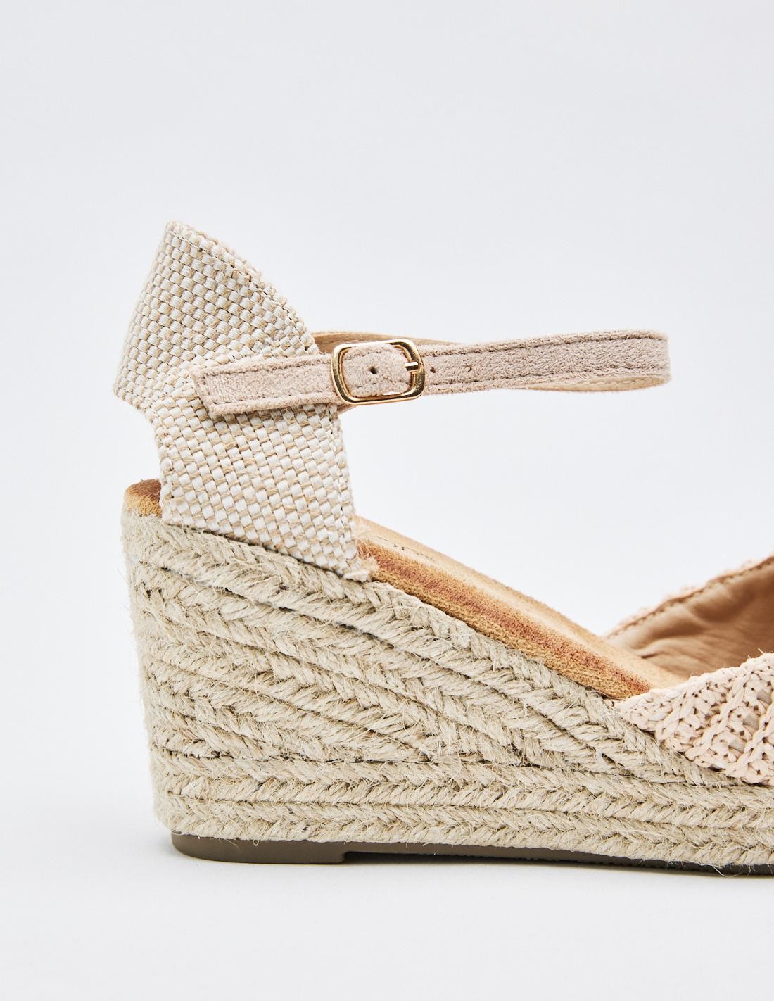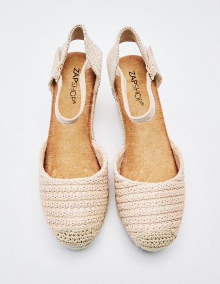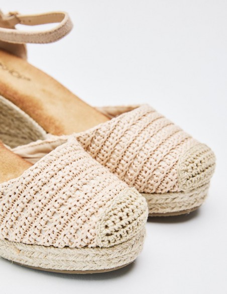 Zapato destalonado tipo cuña en efecto crochet. Tacón alto en forma de cuña.Cierre mediante pulsera en el tobillo. Altura Tacón: 10 cm.