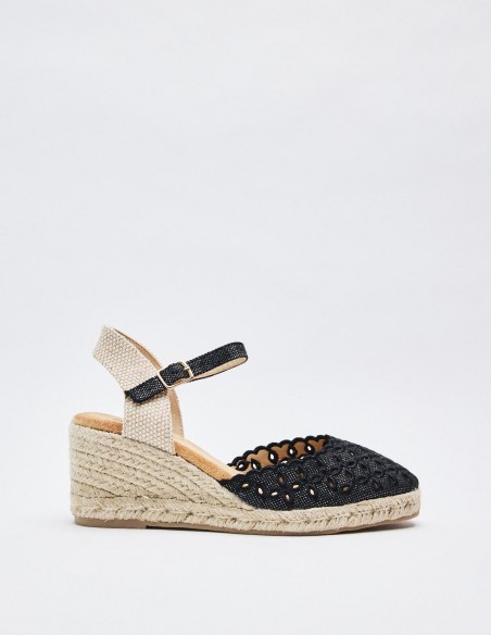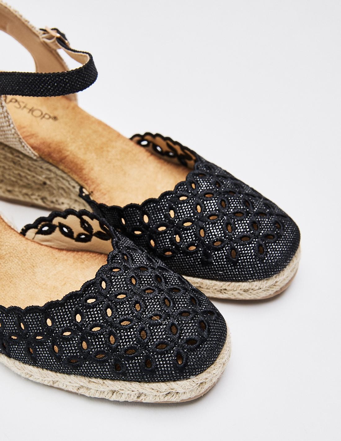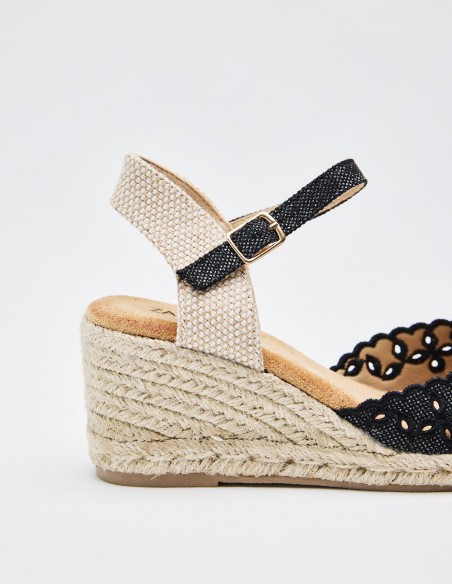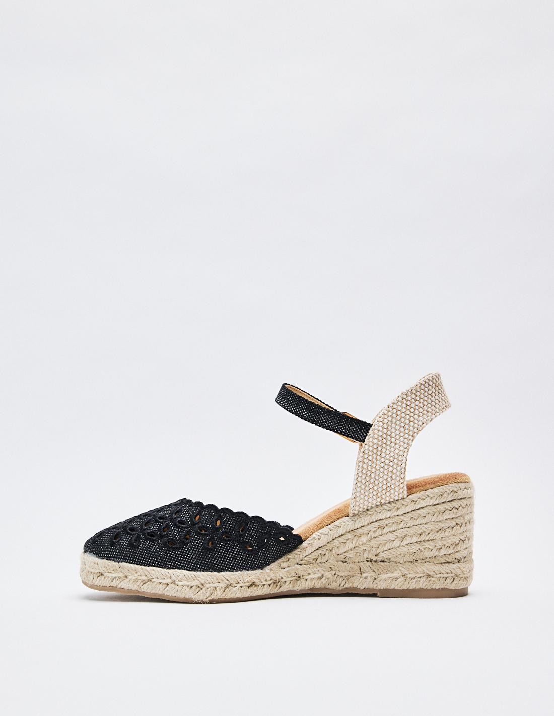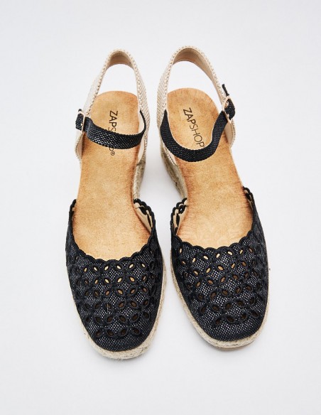 Zapato destalonado tipo cuña en efecto piel con diseño floral . Tacón alto en forma de cuña.Cierre mediante pulsera en el tobillo. Altura Tacón: 10 cm.