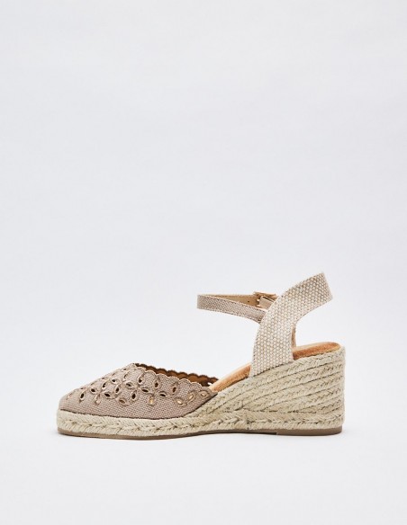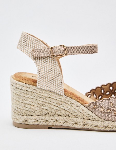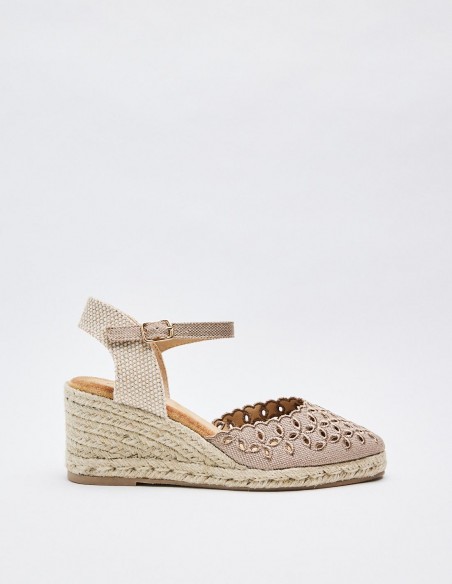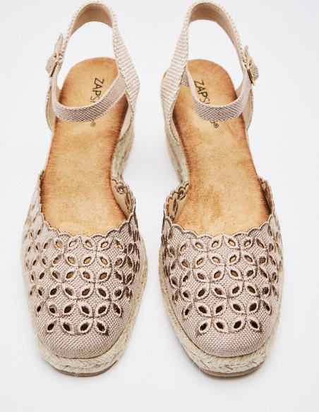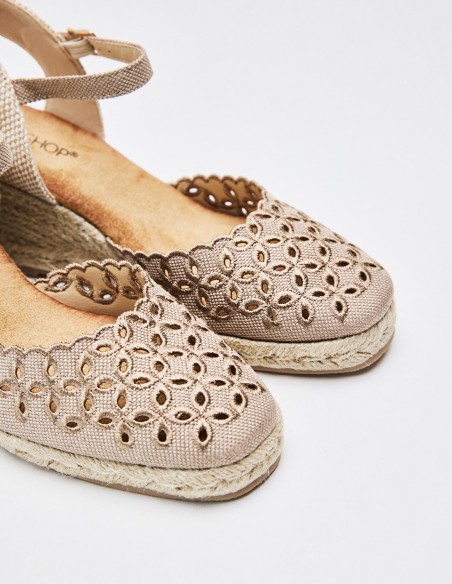 Zapato destalonado tipo cuña en efecto piel con diseño floral . Tacón alto en forma de cuña.Cierre mediante pulsera en el tobillo. Altura Tacón: 10 cm.