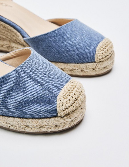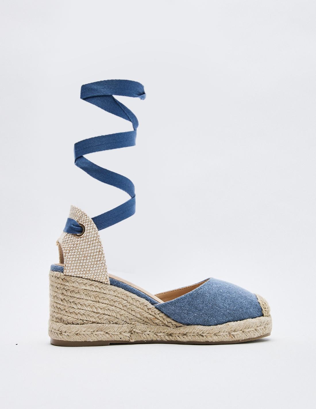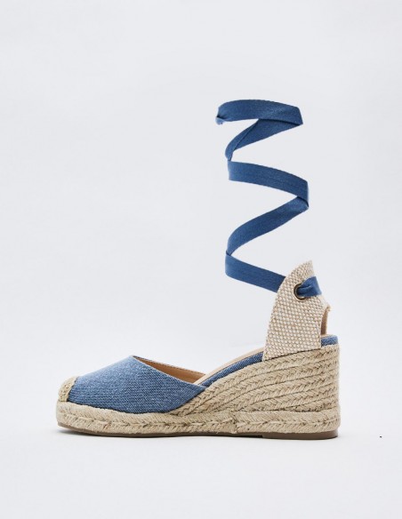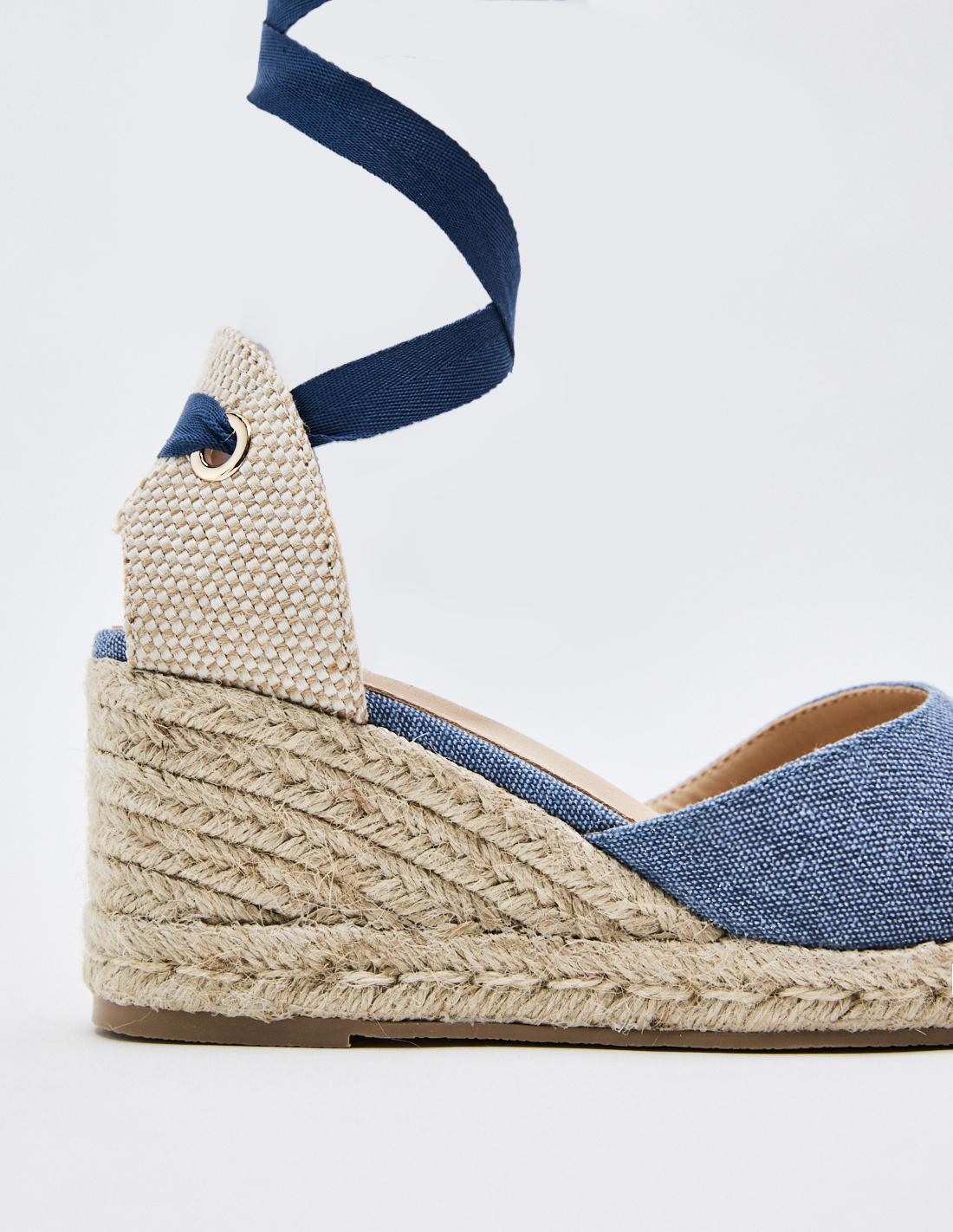 Zapato tipo alpargata con tacón de cuña en efecto yute . Combinación de materiales en el corte. Tiras para atar en el tobillo. Altura del tacón: 6.9 cm.
