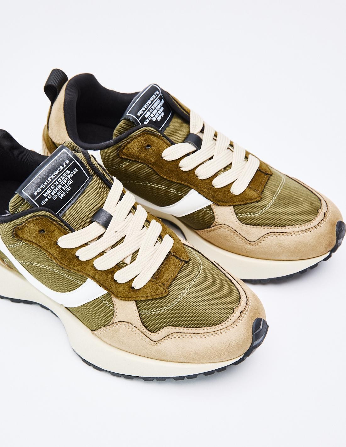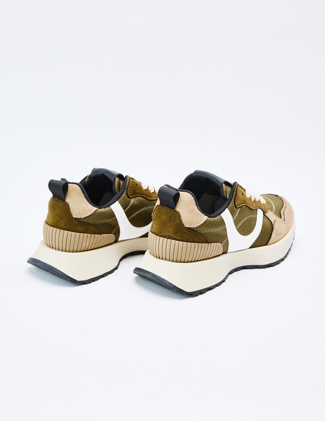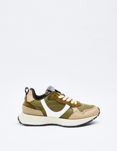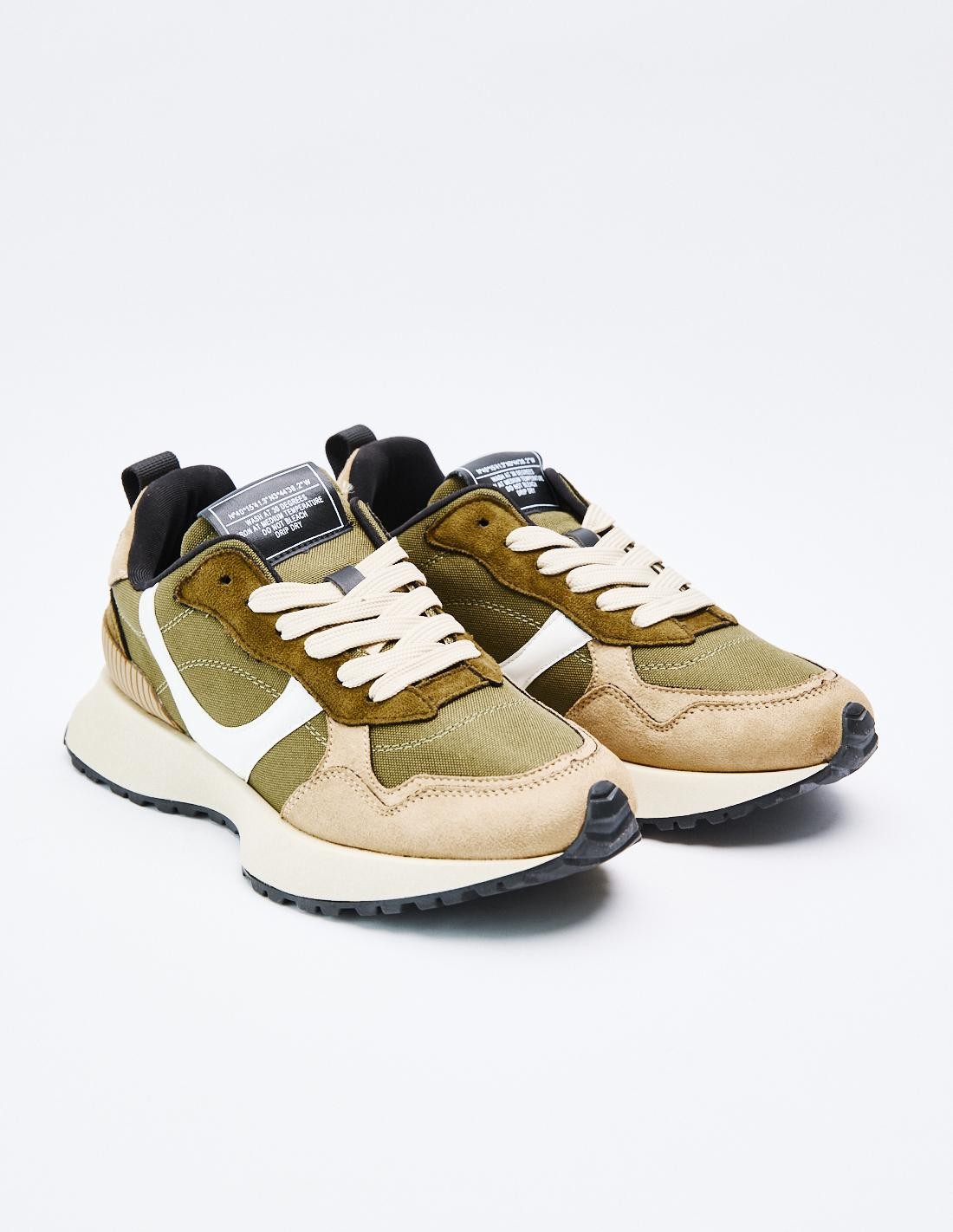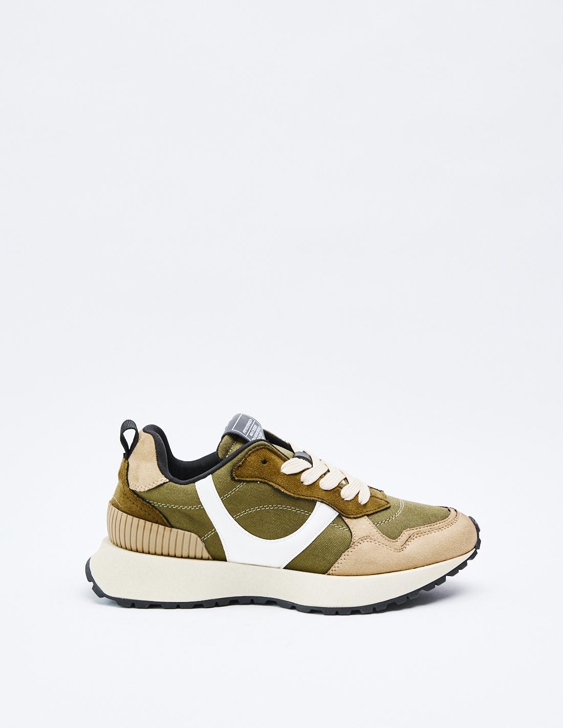 Zapatillas deportivas estilo running en combinación de piezas y materiales. Suela dentada. Detalles en diferentes colores. Cierre mediante cordones.