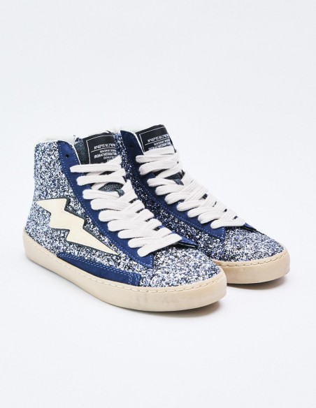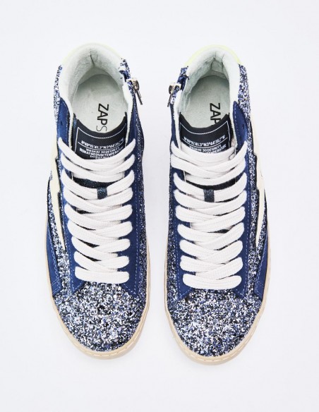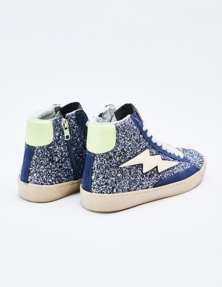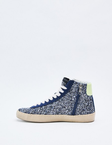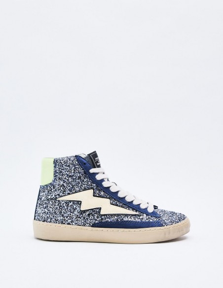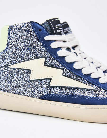 Zapatillas deportivas estilo botín combinadas en tejido y color con destellos en purpurinas . Suela de goma. Cierre mediante cordones. Altura de la suela: 2 cm.