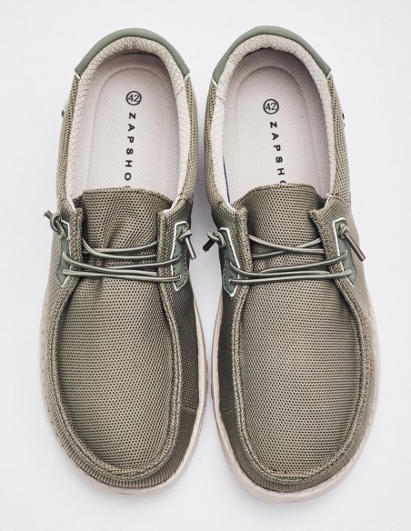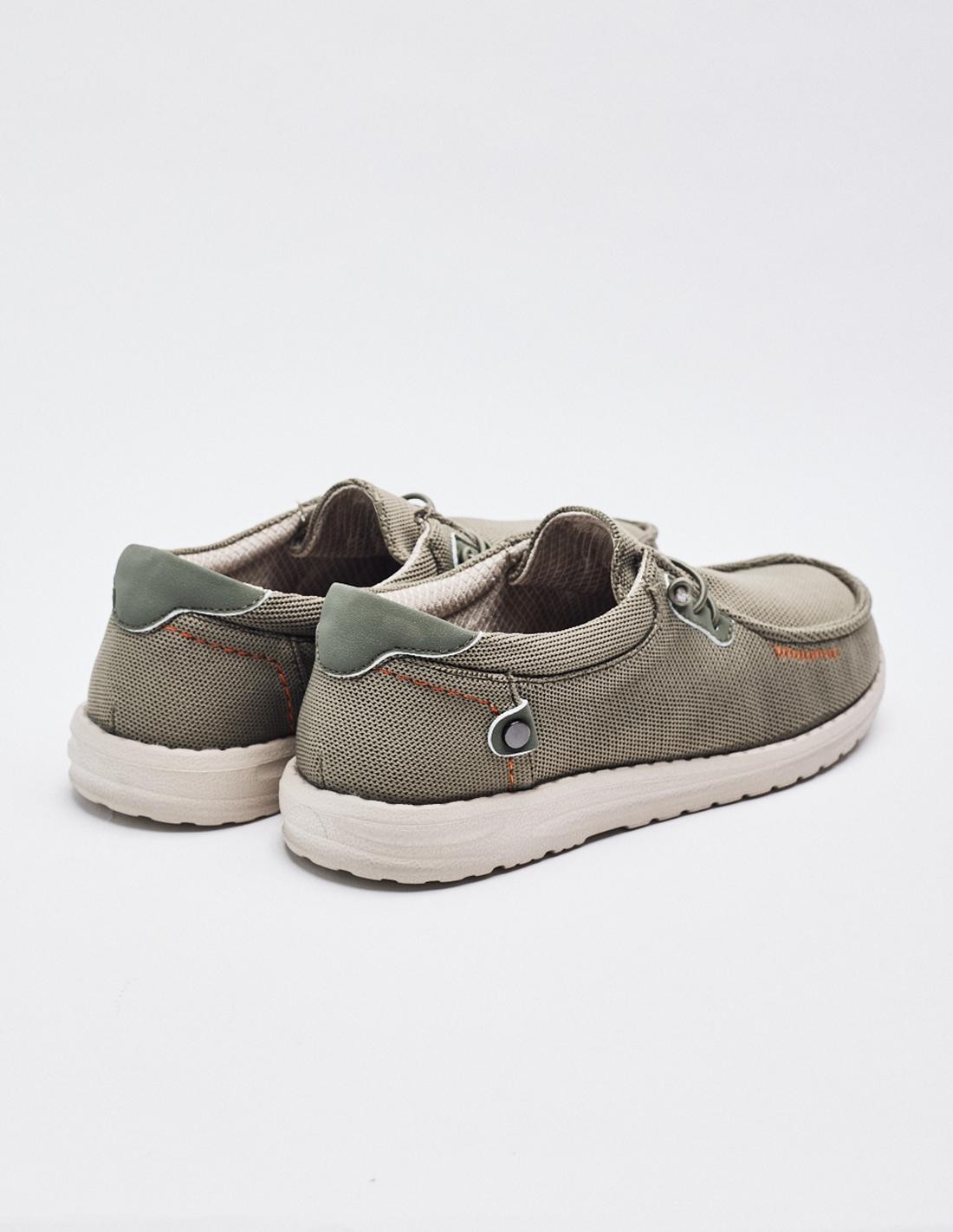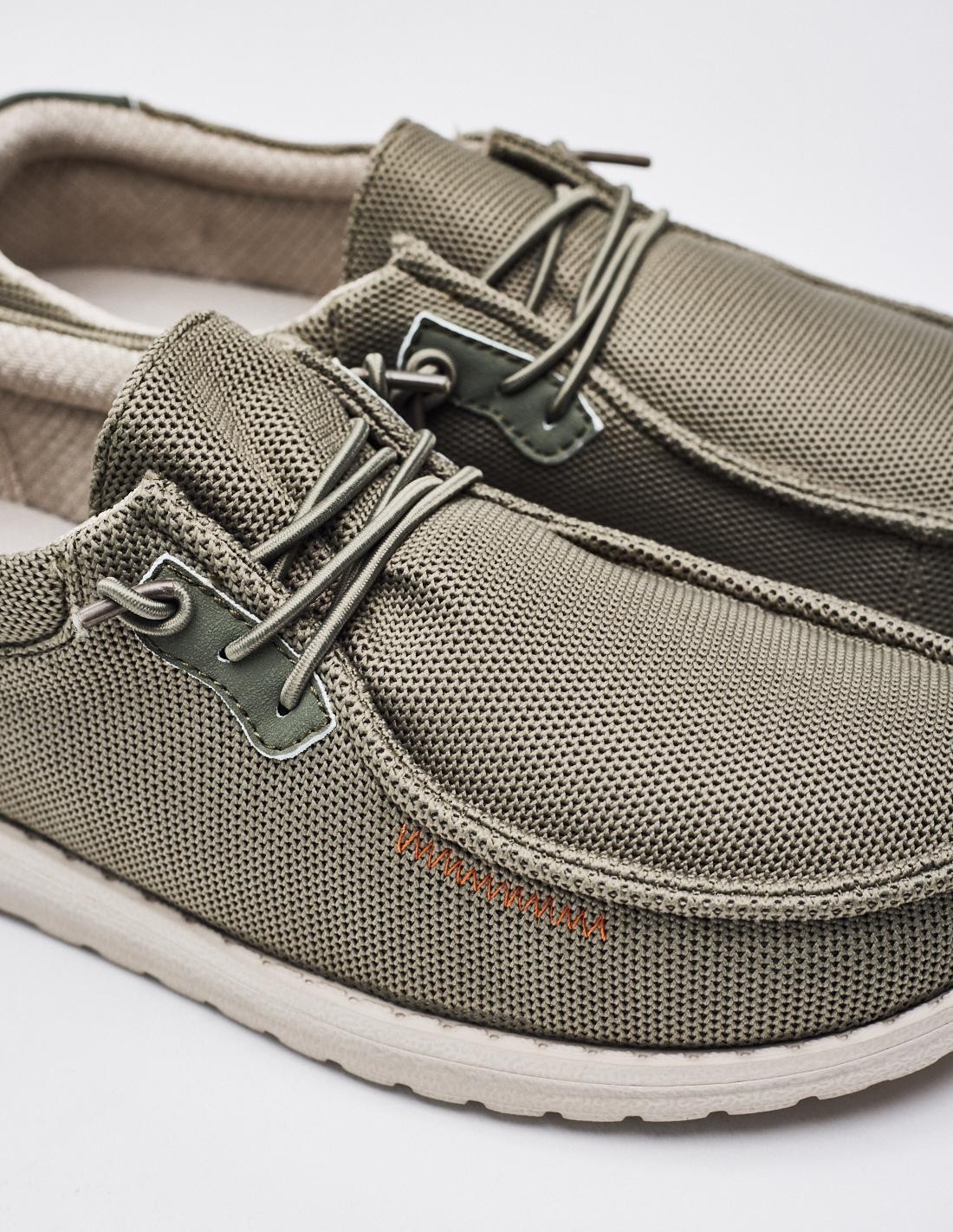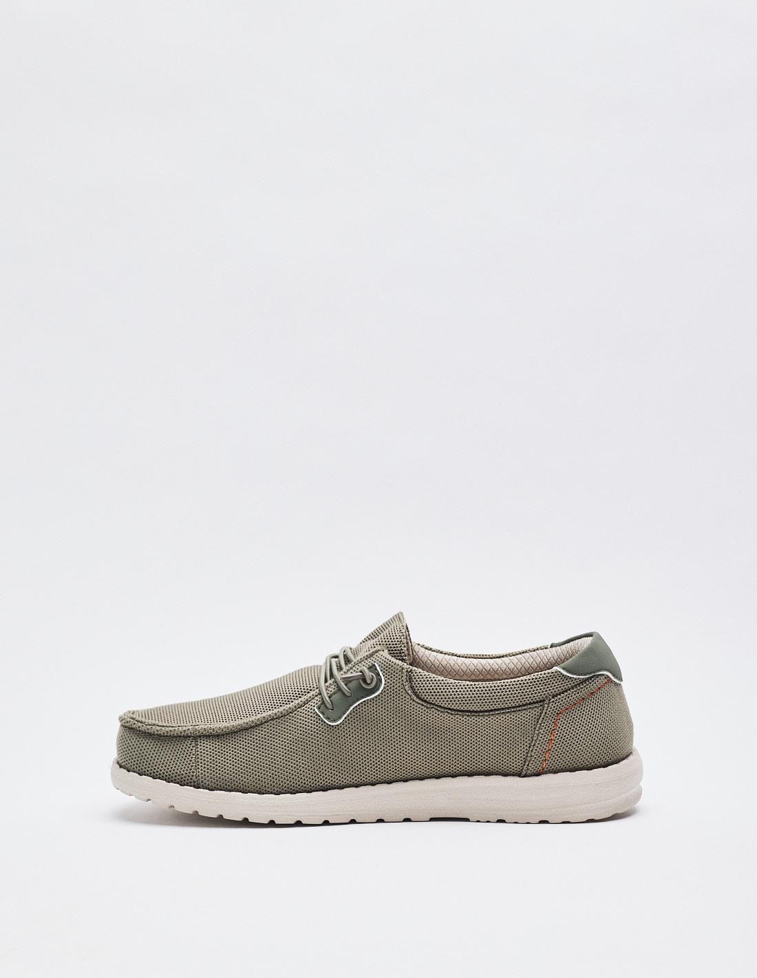 Zapato estilo náutico en efecto tejido. Detalle de bordón en el empeine. Horma redonda. Suela a tono