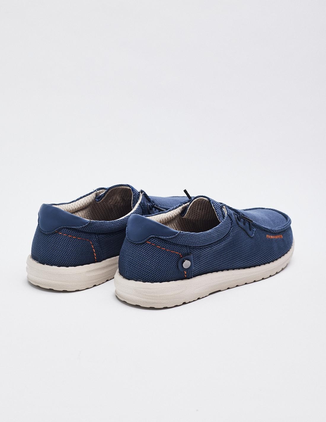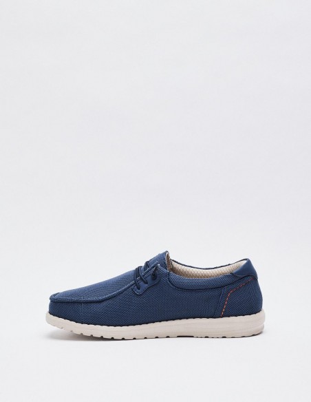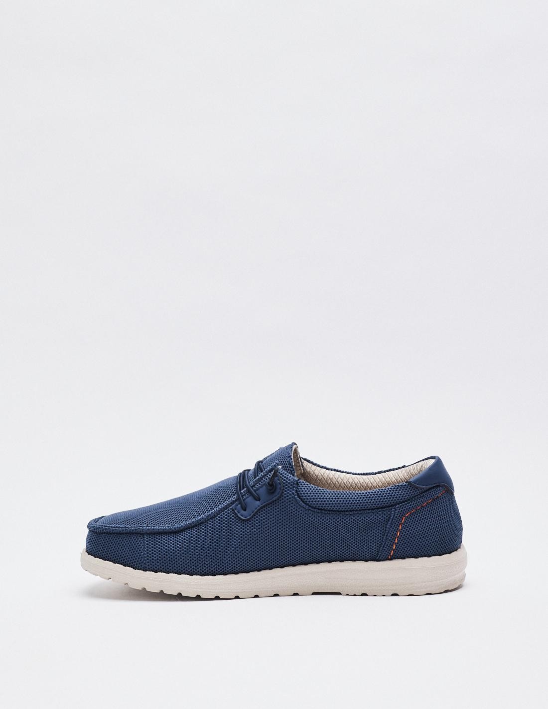 Zapato estilo náutico en efecto tejido. Detalle de bordón en el empeine. Horma redonda. Suela a tono.