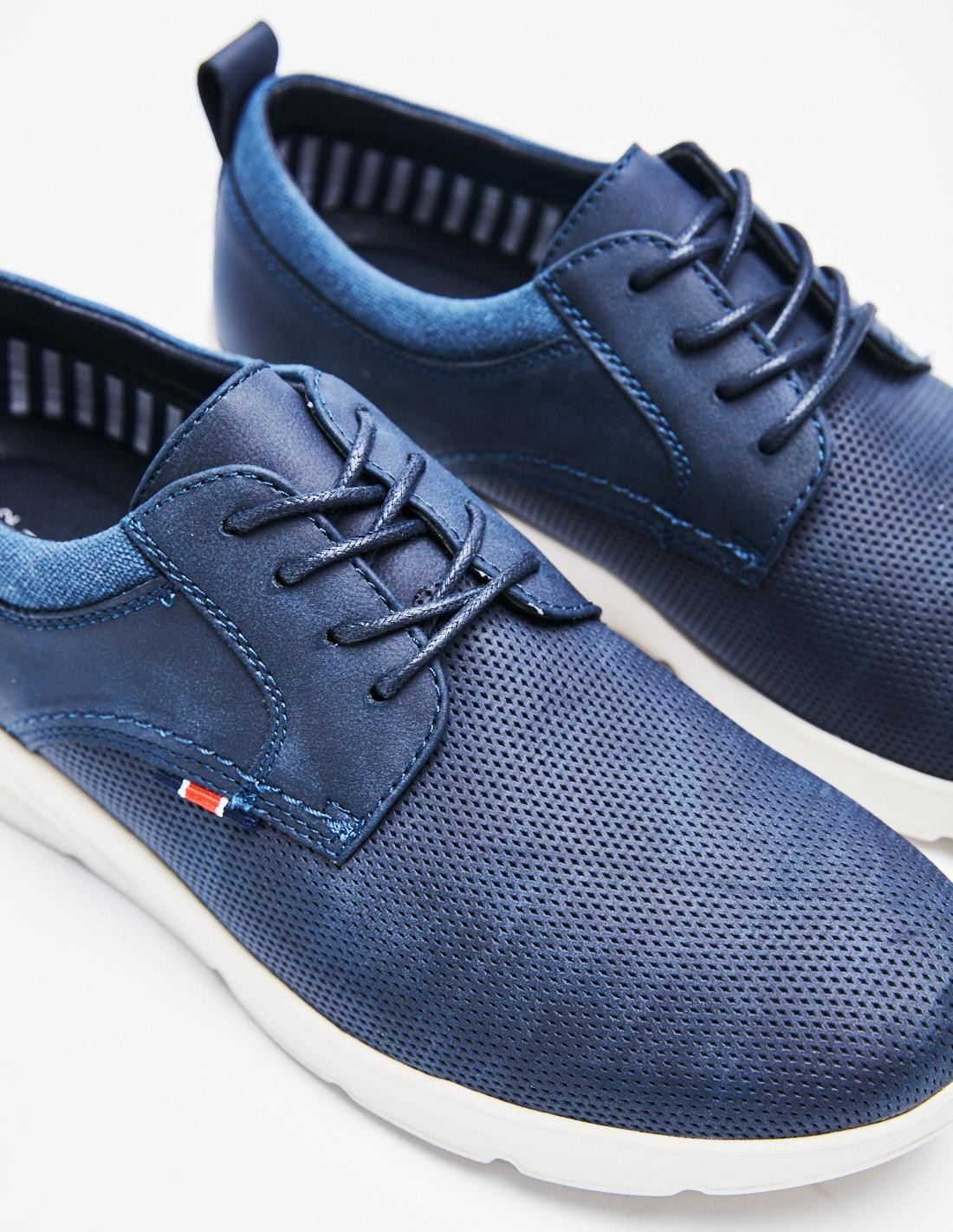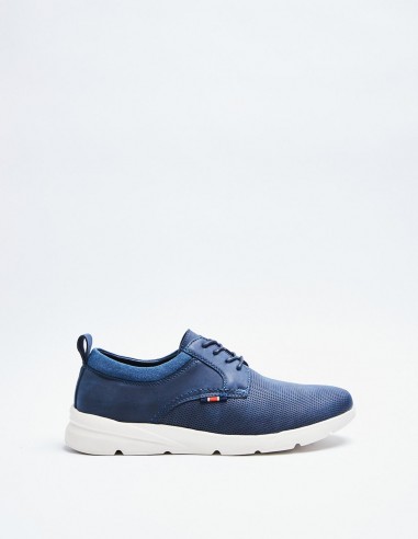 Zapatilla deportiva. Combinación de materiales y piezas en el corte. Cordonera con seis pasados. Piso con volumen y diseño irregular. Estilo retro.