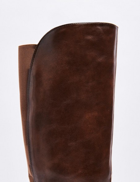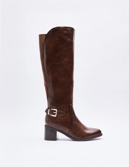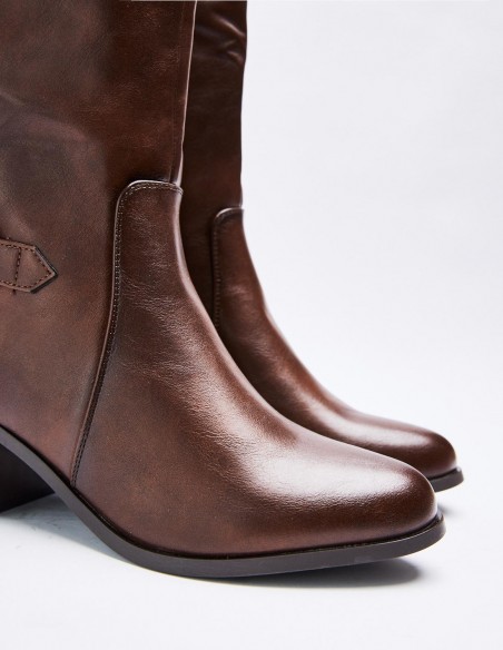 Zapato tipo bota en efecto piel diseño hípica. Detalle de pespunte en el cuerpo. Tacón bajo en bloque. Calce fácil mediante pull on . Acabado en punta redonda. Cierre mediante cremallera en los laterales Altura del tacón: 5 cm