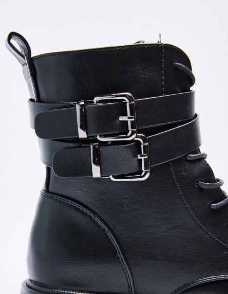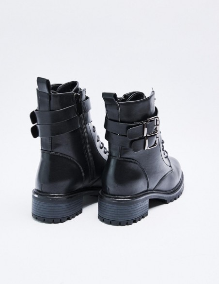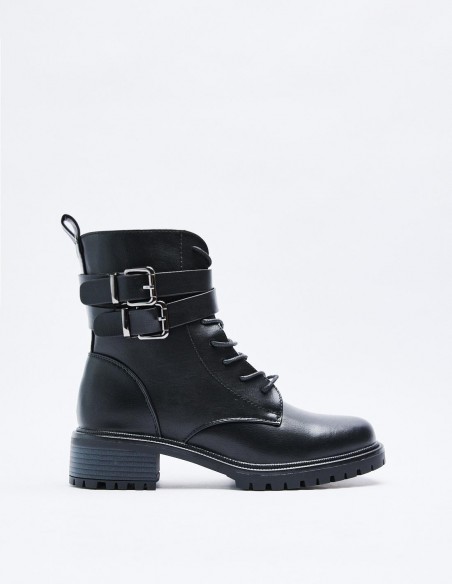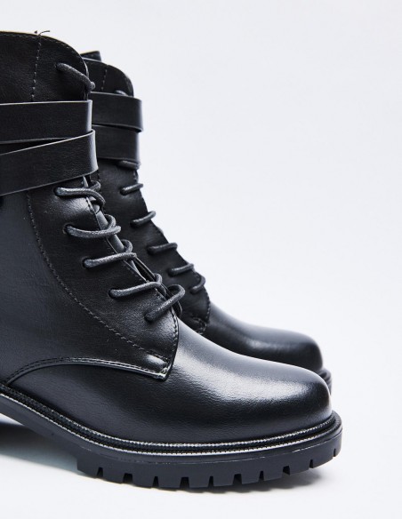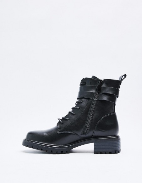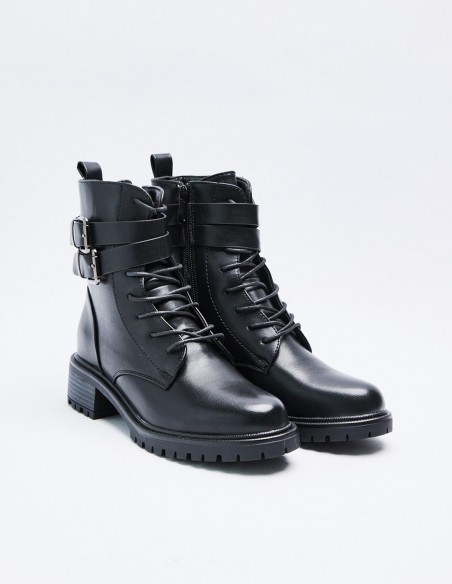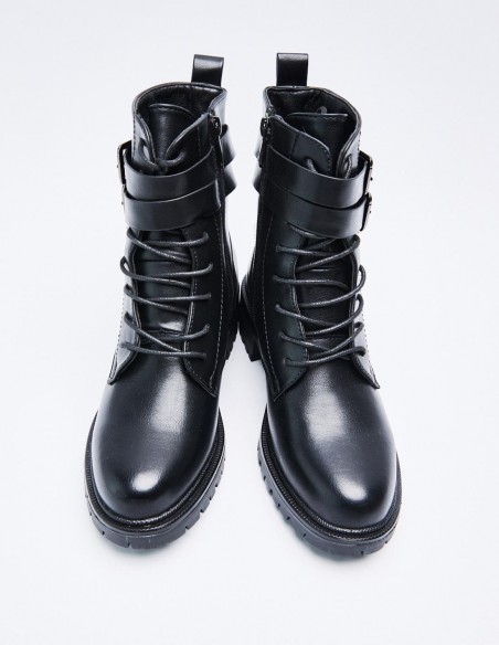 Zapato tipo botín en efecto piel. Suela plana.Tirador trasero. Cierre mediante cordones y cremallera lateral. Acabado en punta redonda.