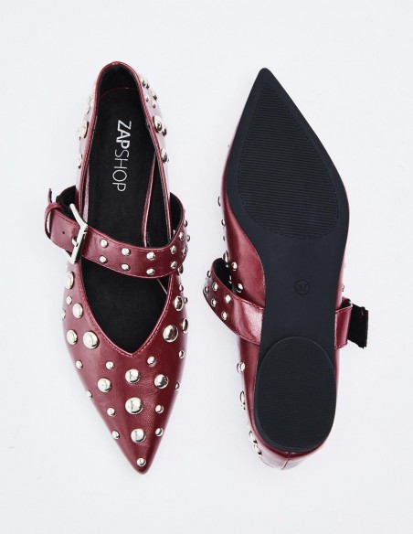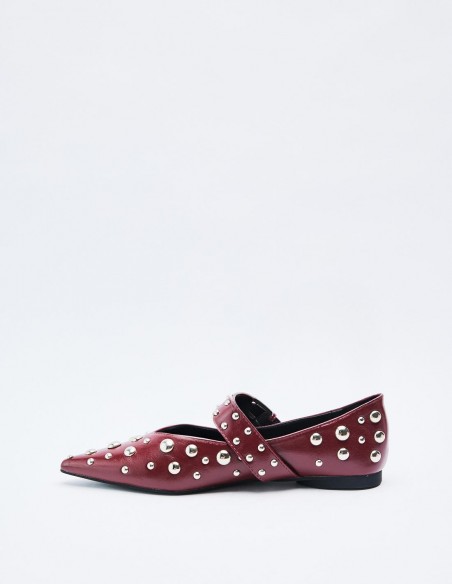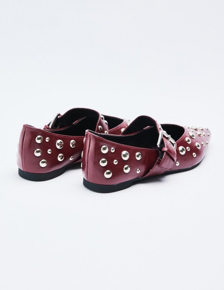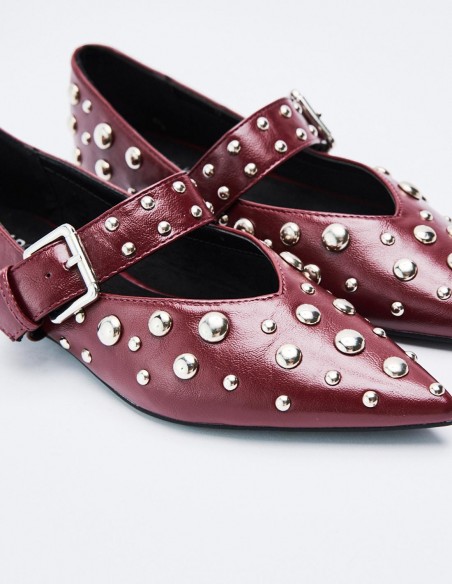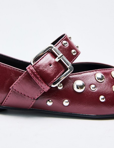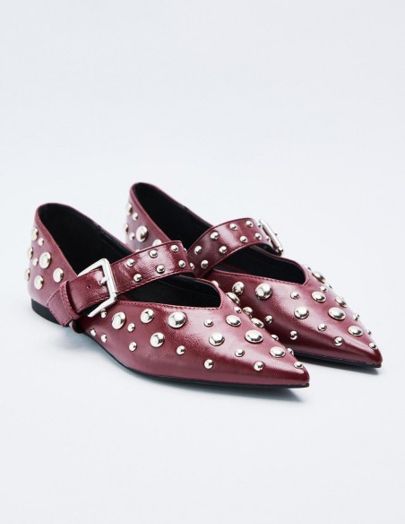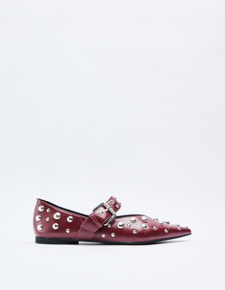 Zapato plano tipo bailarina en combinacion de materiales . Detalle de tira ancha con hebilla ajustable en la parte delantera. Altura de la suela: 1 cm.