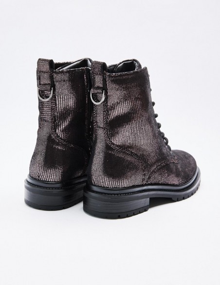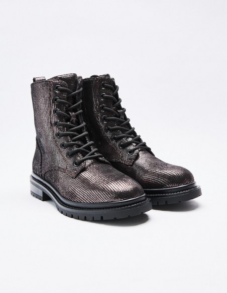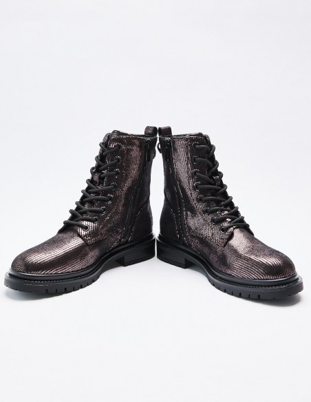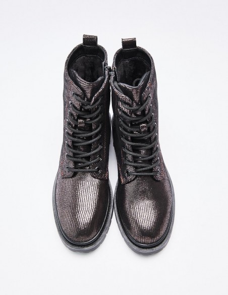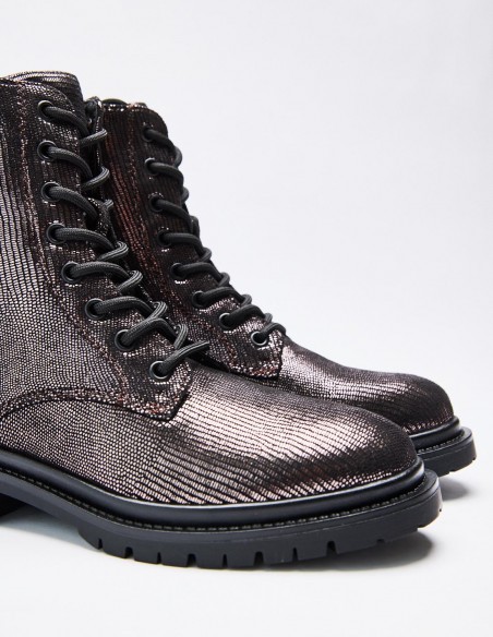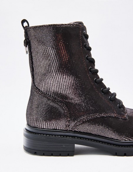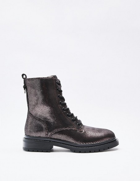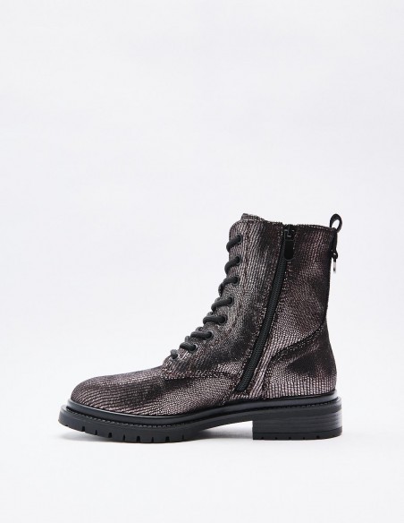 Zapato tipo botín en efecto brillante. Suela plana.Tirador trasero. Cierre mediante cordones y cremallera lateral. Acabado en punta redonda. Altura de la suela: 2,5 cm.