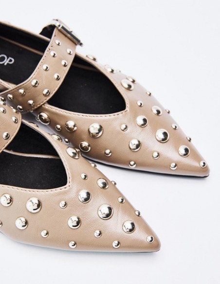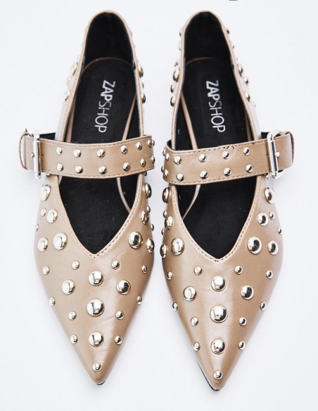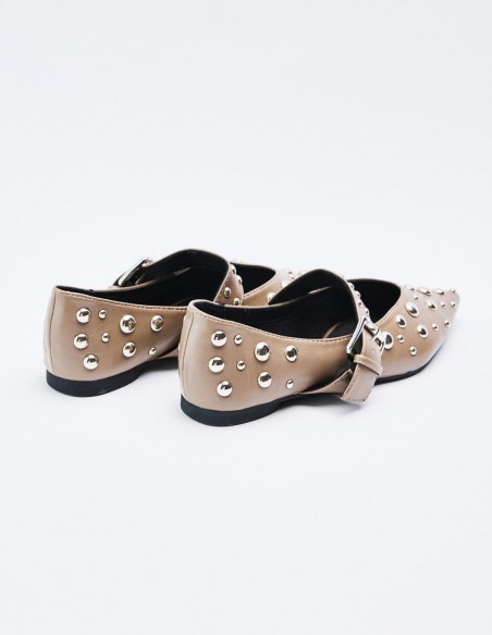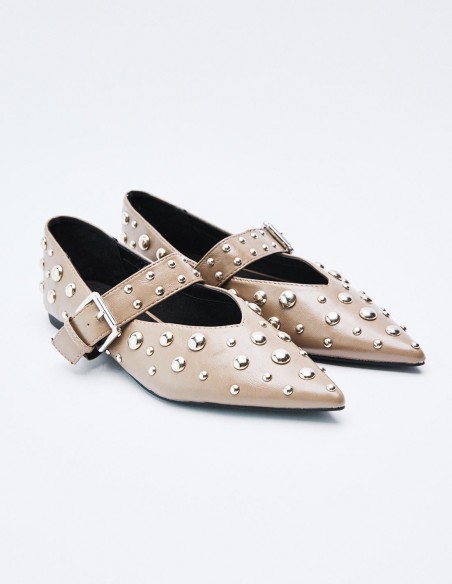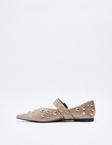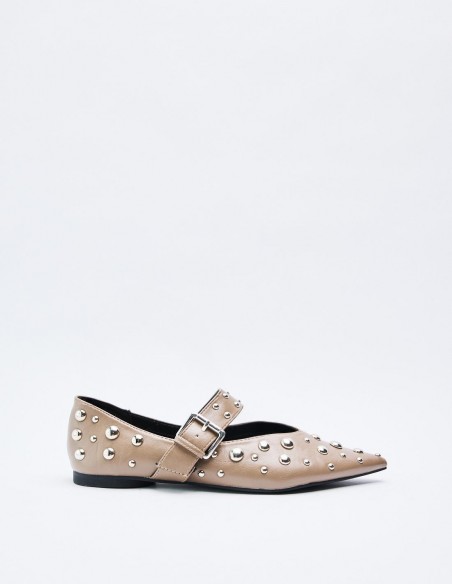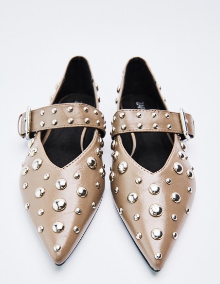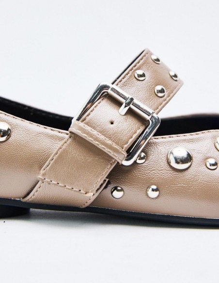 Zapato plano tipo bailarina en combinacion de materiales . Detalle de tira ancha con hebilla ajustable en la parte delantera. Altura de la suela: 1 cm.