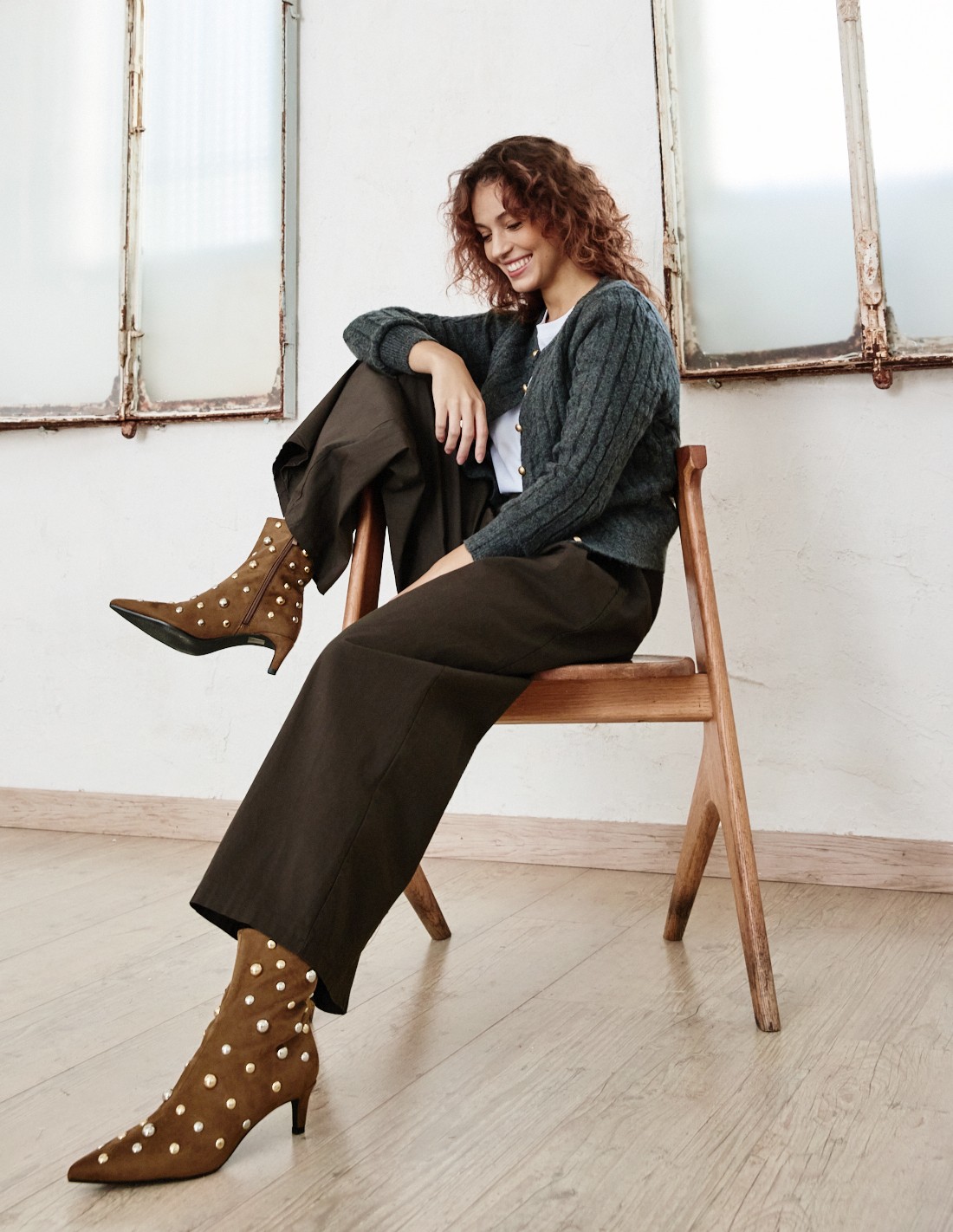 Zapato plano tipo botín en efecto serraje en combinacion de materiales . Detalle de borlas metalicas en todo el zapato. Altura de la suela: 5 cm.