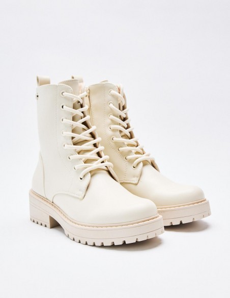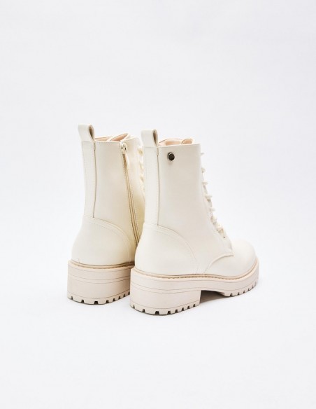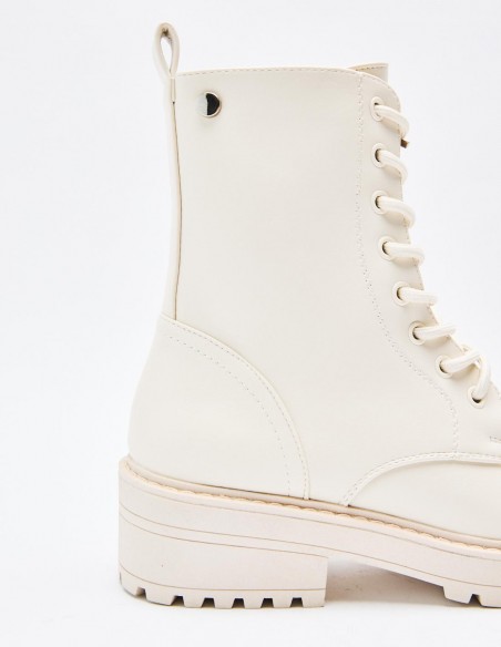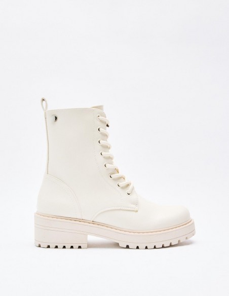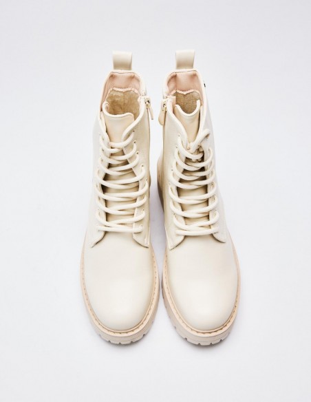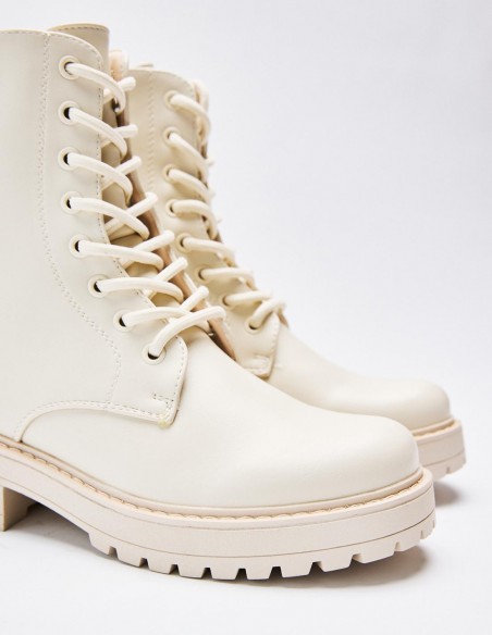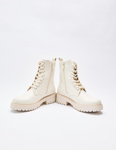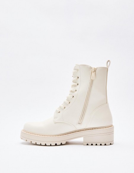Zapato tipo botín en efecto piel. Suela plana.Tirador trasero. Cierre mediante cordones y cremallera lateral. Acabado en punta redonda. Altura de la suela: 2,5 cm.