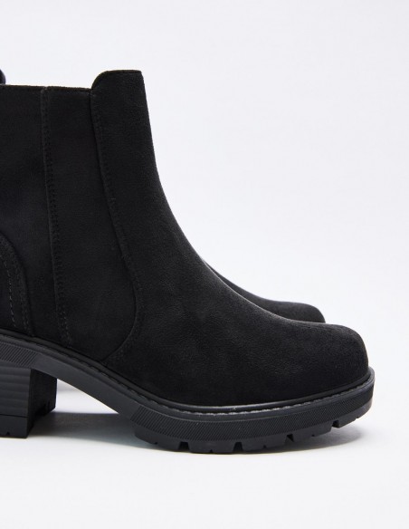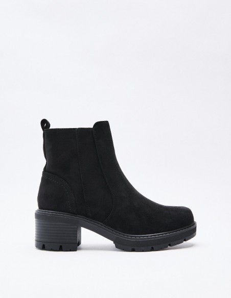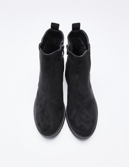 Zapato de tacón tipo botín en serraje. Acabado en punta redonda. Tiradores en la parte trasera. Cierre mediante cremallera en el lateral. Altura del tacón: 4,4 cm.