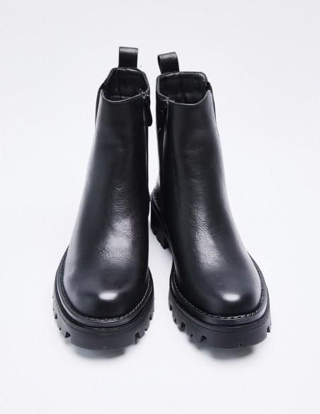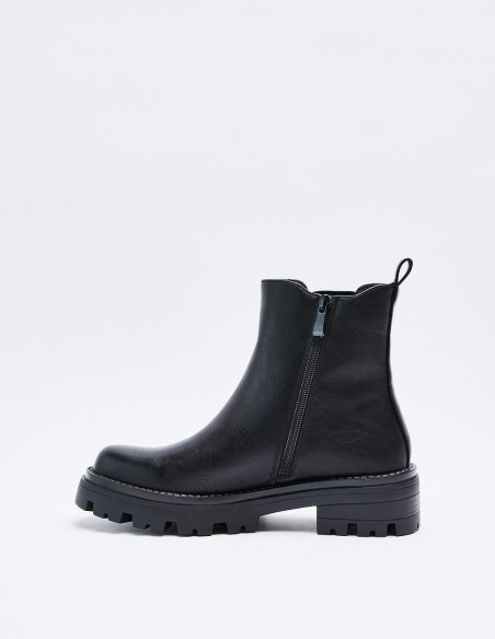 Zapato tipo botín efecto piel track .. Caña ajustada con paneles elásticos en los laterales. Punta redondeada. Cierre mediante cremallera en los laterales.