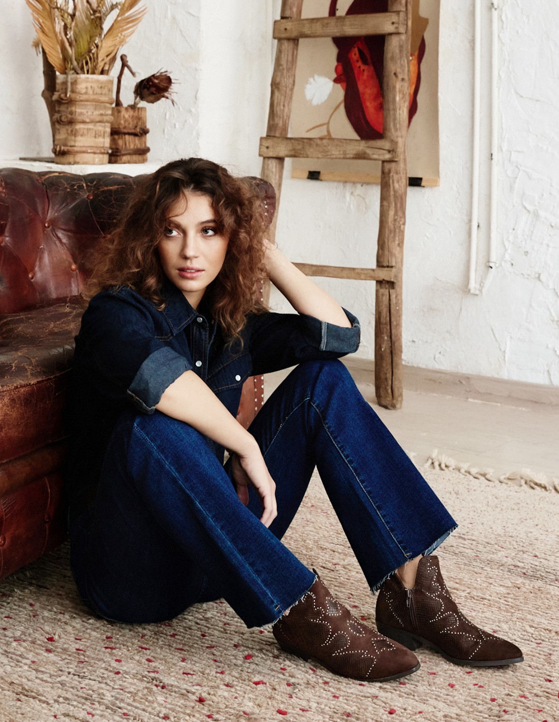 Zapato tipo botín tacón en efecto piel . Estilo cowboy. Detalle de abalorios .Acabado en punta. Cierre mediante cremallera en el lateral. Altura del tacón: 3 cm.