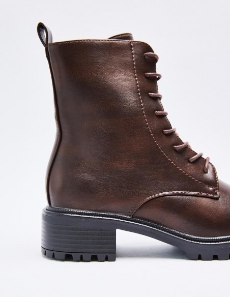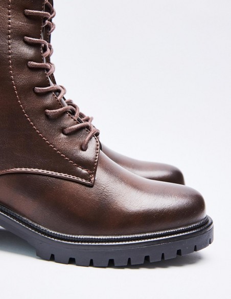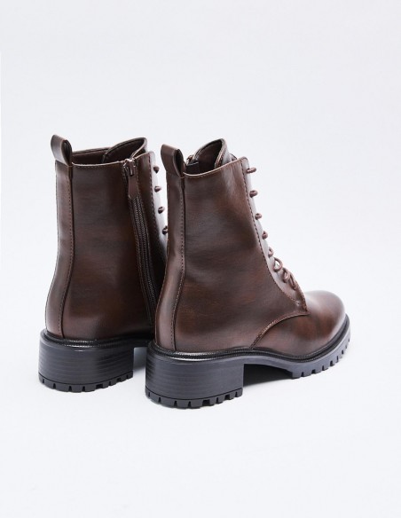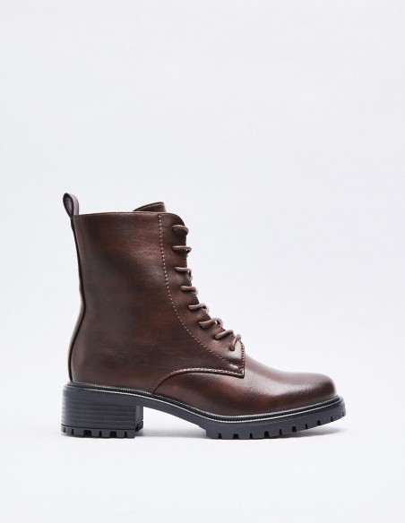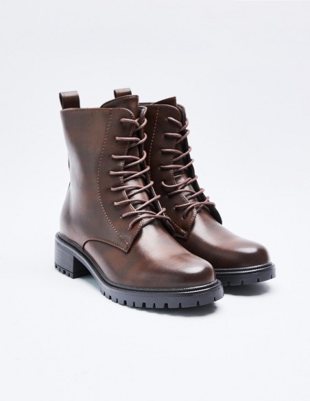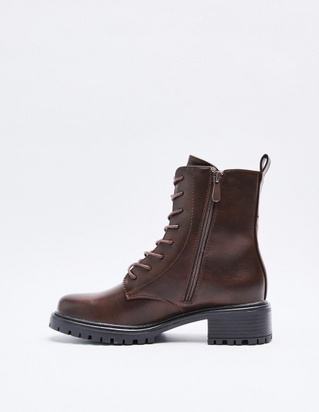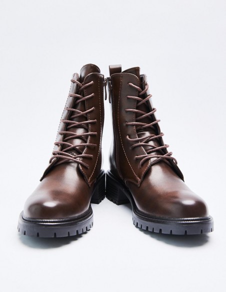 Zapato tipo botín en efecto piel. Suela plana.Tirador trasero. Cierre mediante cordones y cremallera lateral. Acabado en punta redonda.