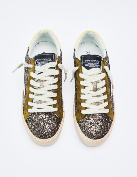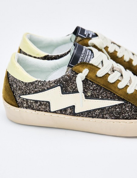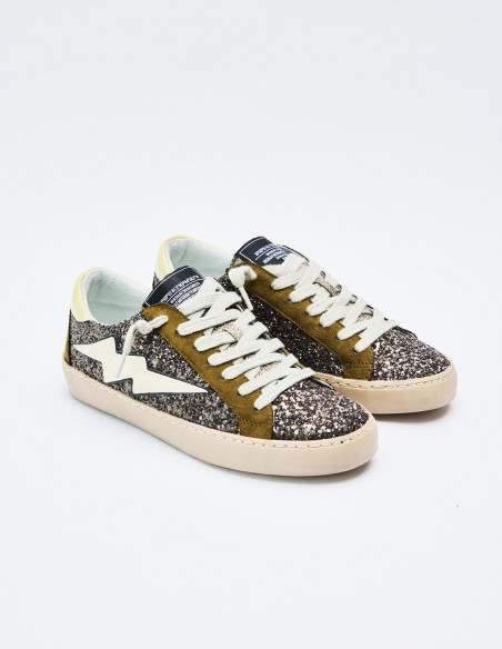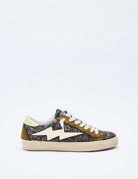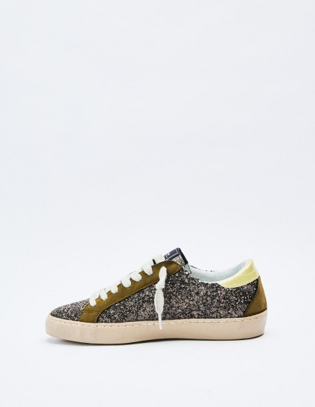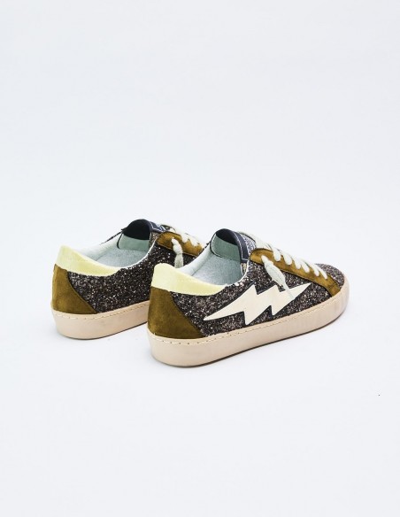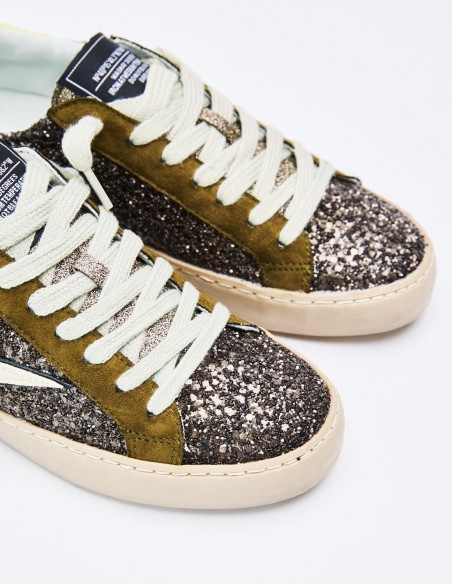 Zapatillas deportivas combinadas en tejido y color con destellos en purpurinas . Suela de goma. Cierre mediante cordones. Altura de la suela: 2 cm.