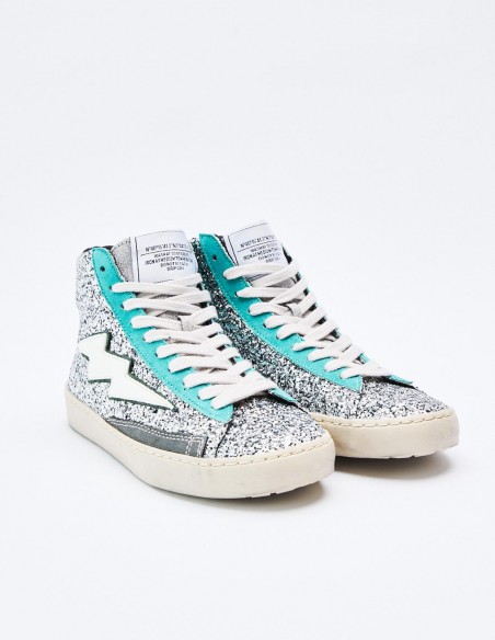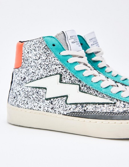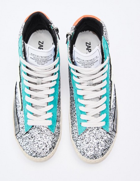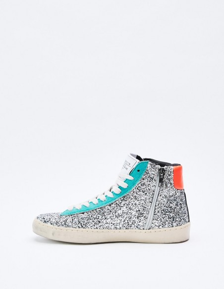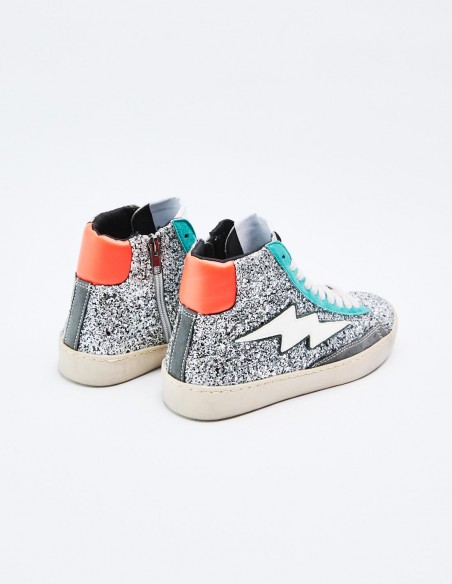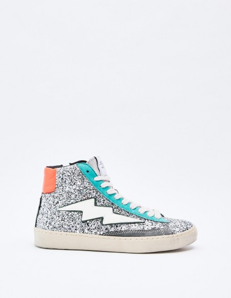 Zapatillas deportivas estilo botín combinadas en tejido y color con destellos en purpurinas . Suela de goma. Cierre mediante cordones. Altura de la suela: 2 cm.