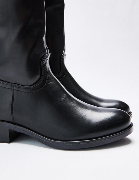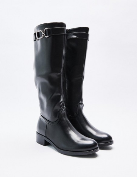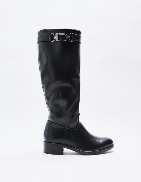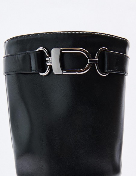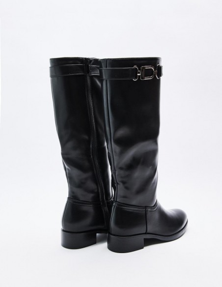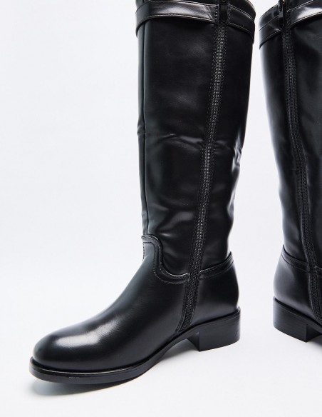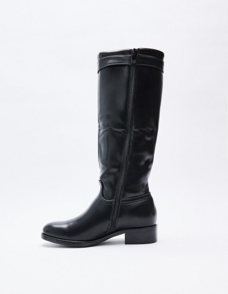 Zapato tipo bota de caña alta en efecto piel . Detalle de tira con hebilla en la caña y pespunte en el cuerpo. Calce fácil mediante pull on. Cierre mediante cremallera en los laterales . Altura del tacón: 2 cm