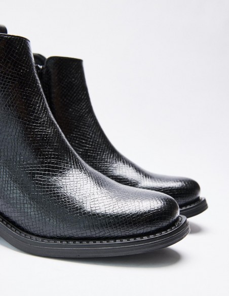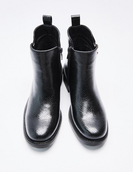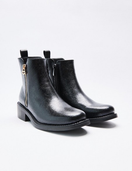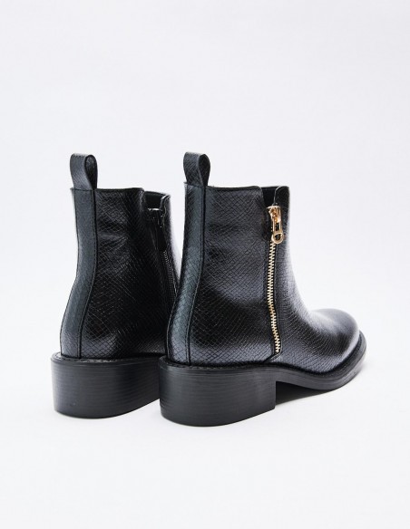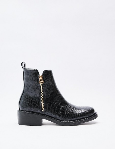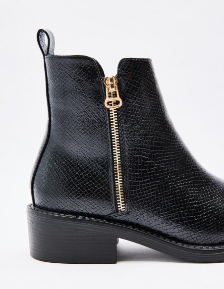Zapato tipo botín plano en efecto piel . Detalle de cremallera en oro .Acabado en punta redonda . Cierre mediante cremallera en el lateral. Altura del tacón: 2 cm.