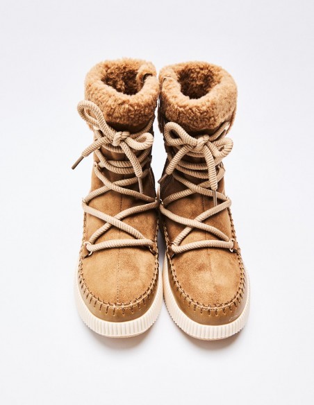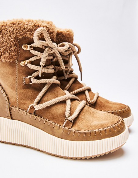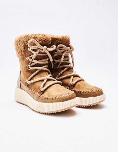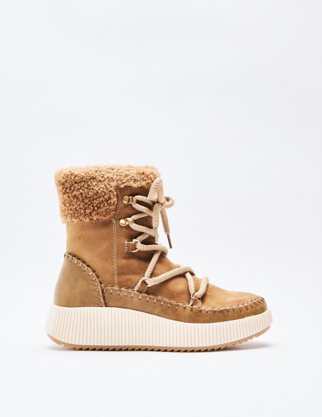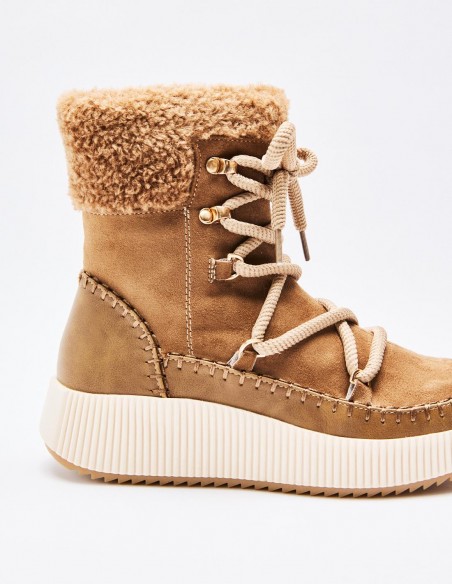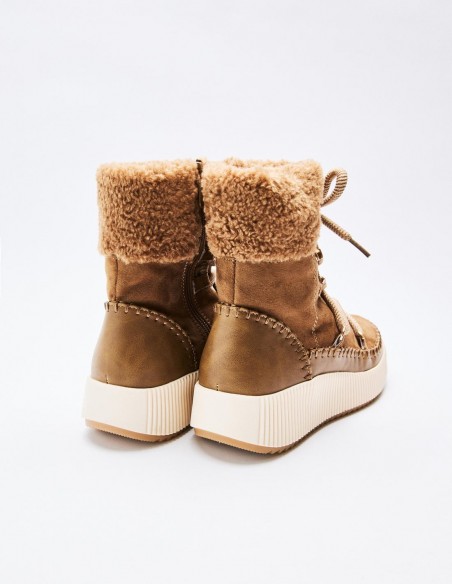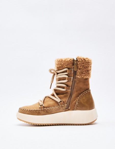Zapato tipo botín en efecto piel combinado en materiales . Detalle de pespunte en el cuerpo. Cierre mediante cremallera. Acabado en punta redonda. Suela combinada de plataforma . Altura de la suela: 3 cm