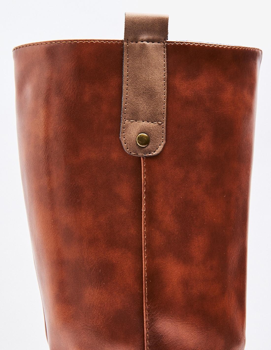 Zapato tipo bota estilo hípica. Detalle de cinta. Tirador trasero. Caña alta. Calce mediante pull on. Tacón bajo ancho. Acabado en punta redonda. Cierre mediante cremalleras en los laterales. Altura del tacón: 5 cm