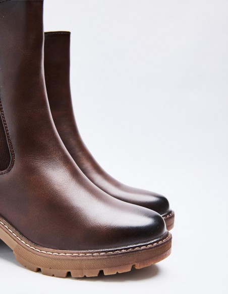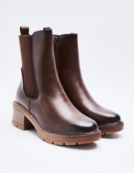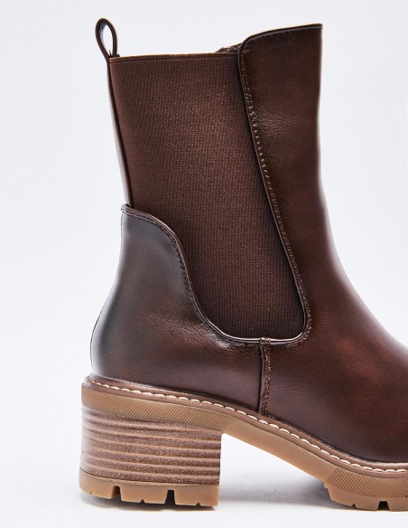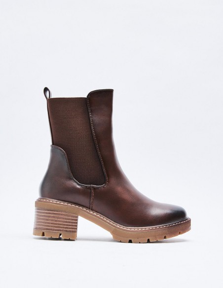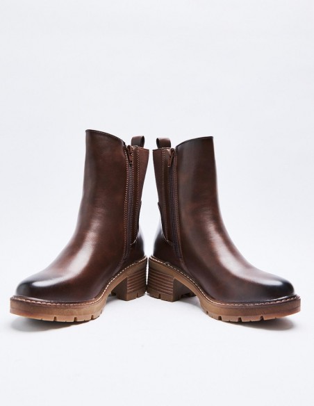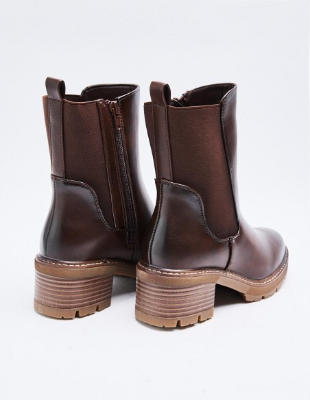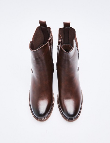 Zapato tipo botín efecto piel track .. Caña ajustada con paneles elásticos en los laterales. Punta redondeada. Cierre mediante cremallera en los laterales.