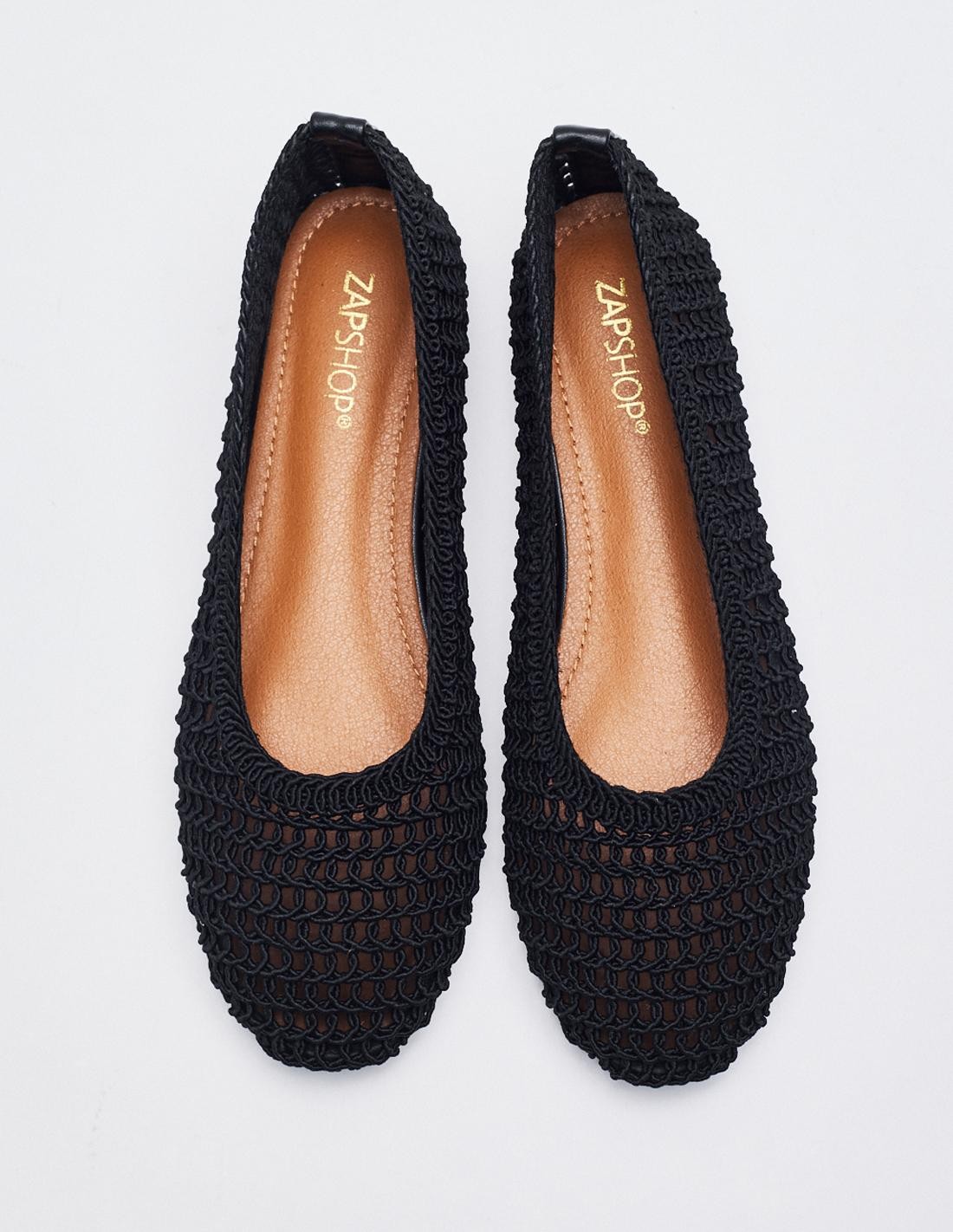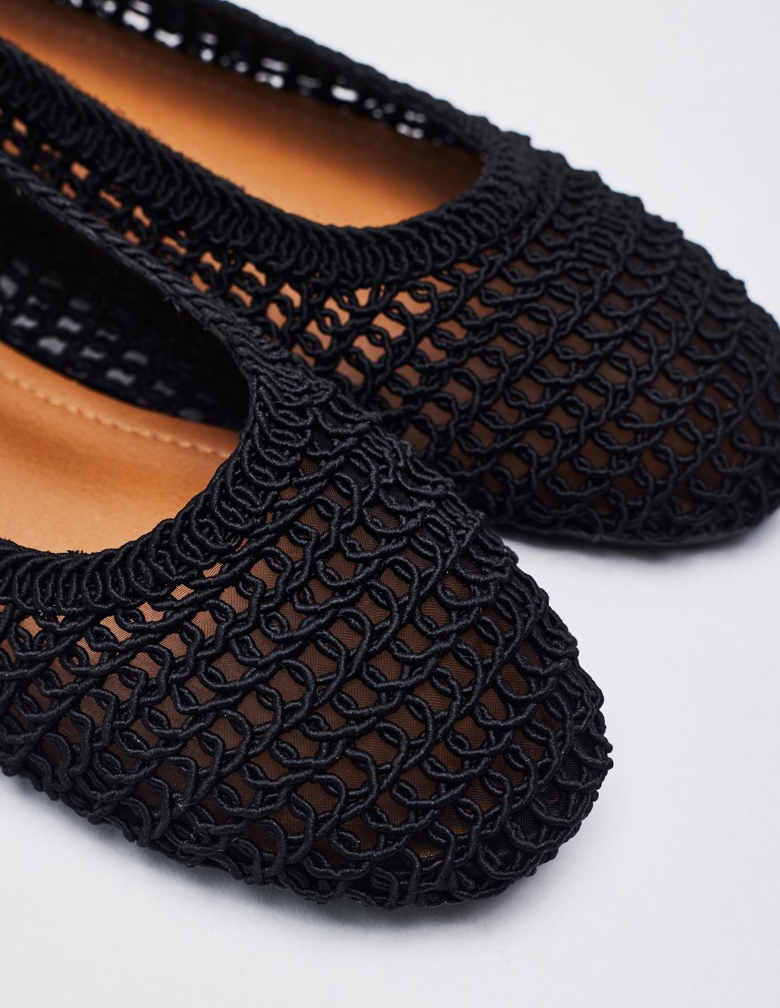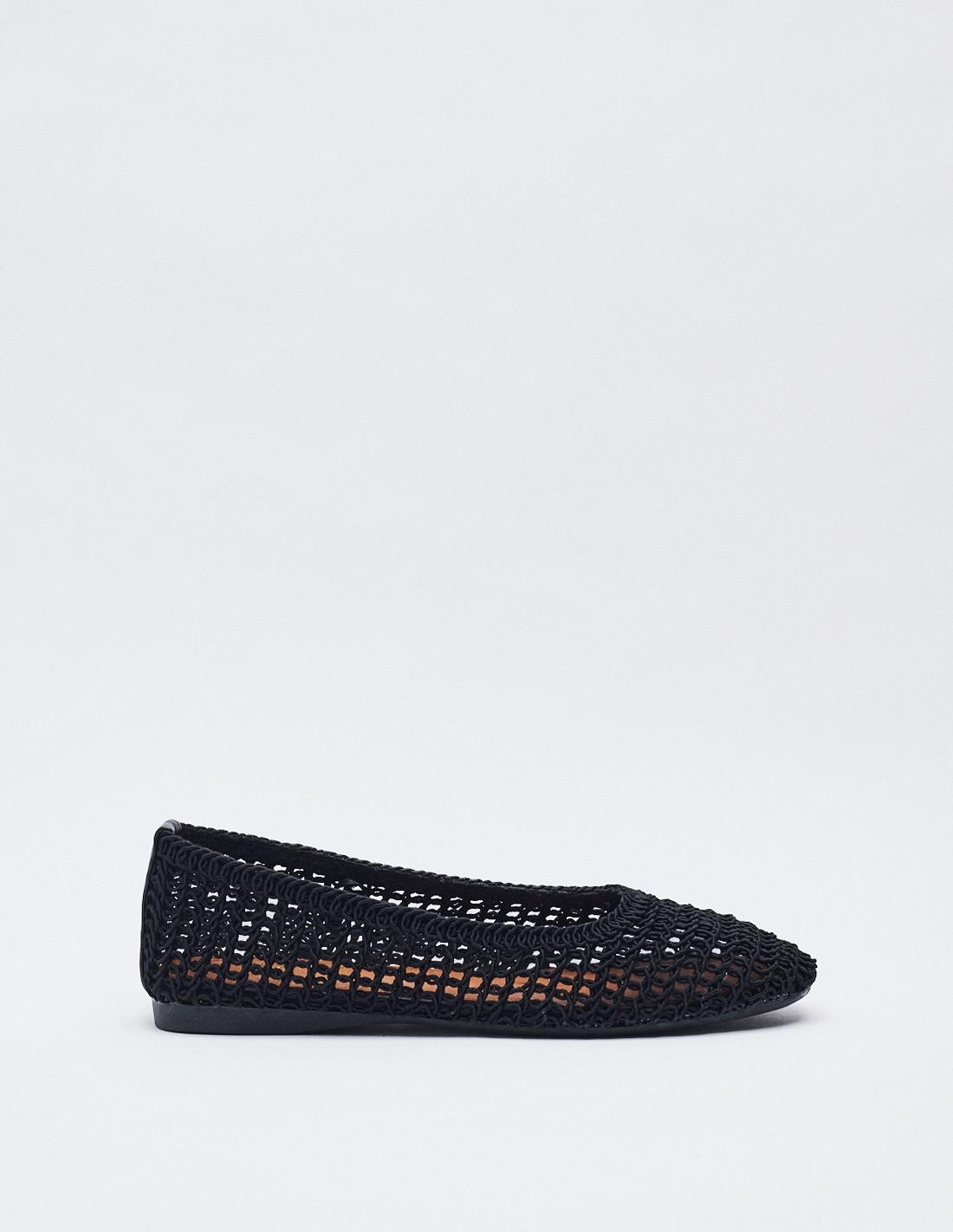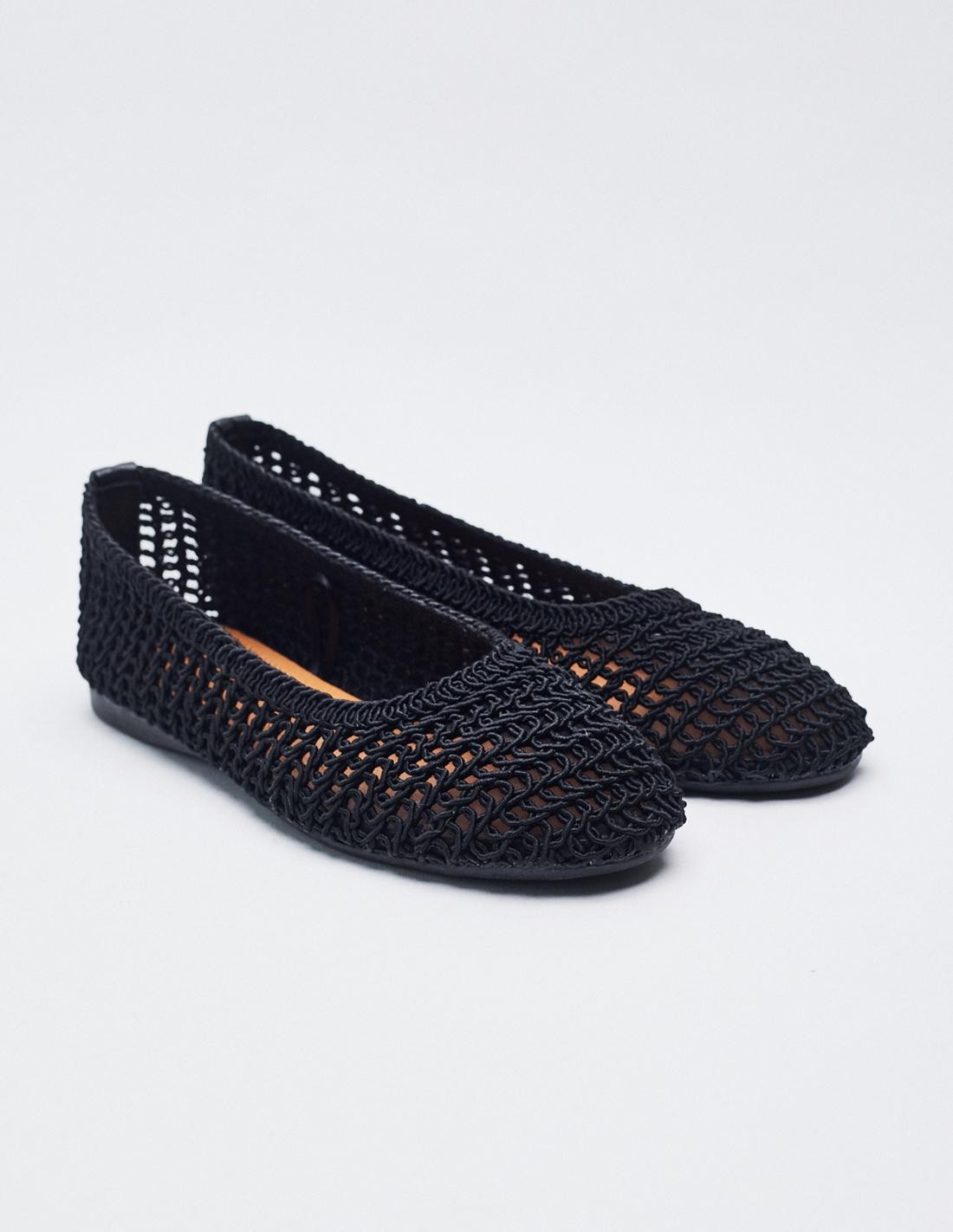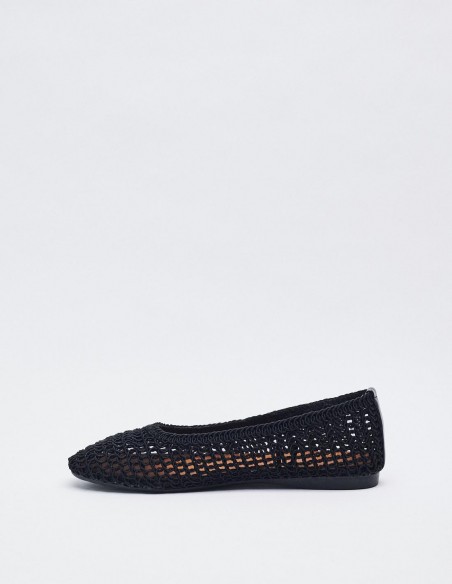 Zapato tipo bailarina con cuerpo trenzado. Acabado en punta redonda. Altura de la suela 1 cm
