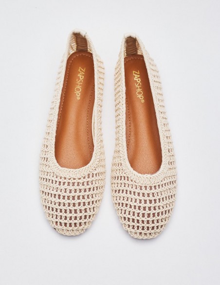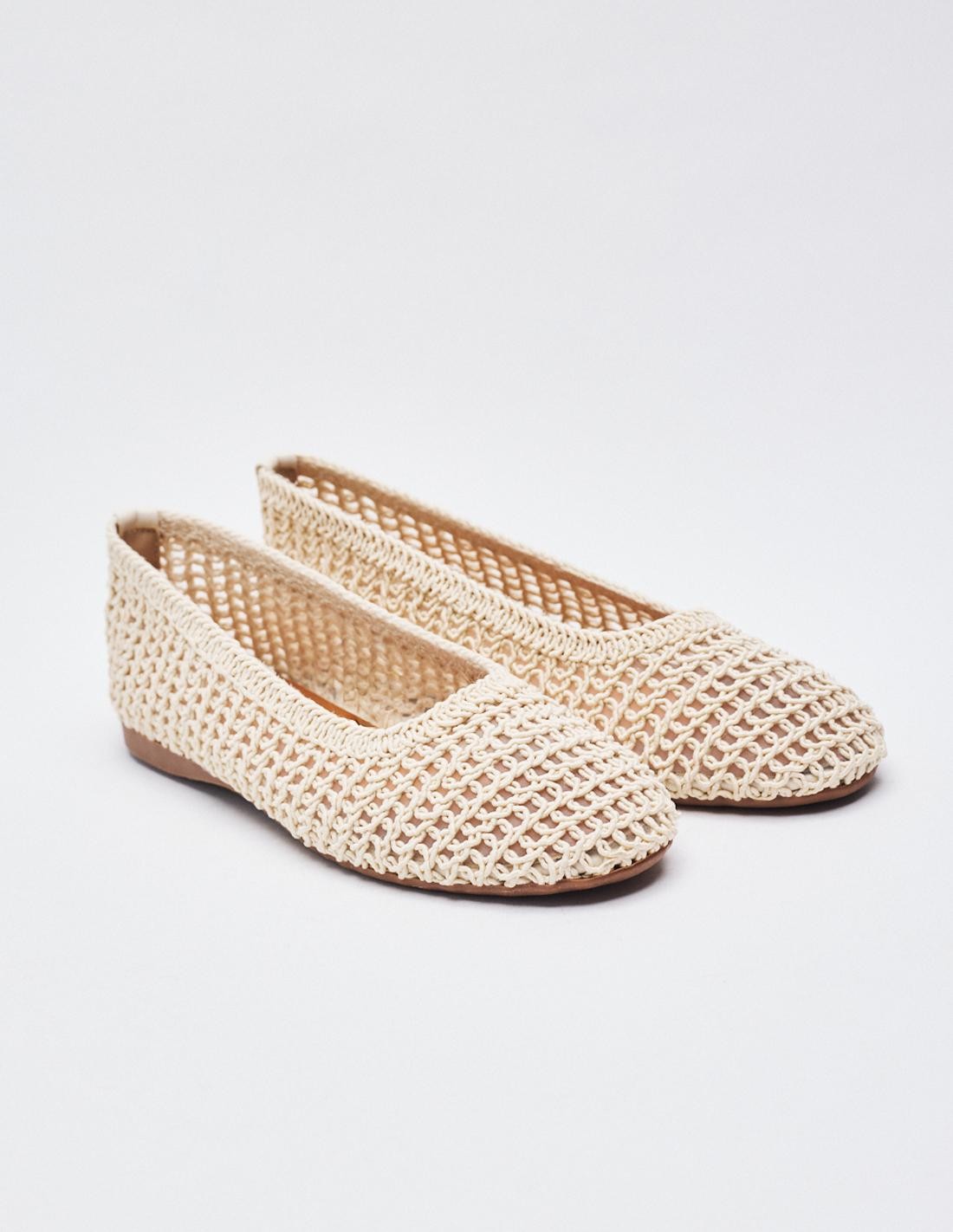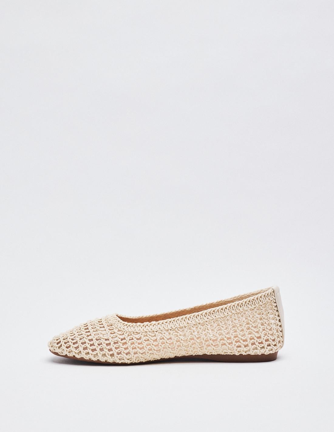 Zapato tipo bailarina con cuerpo trenzado. Acabado en punta redonda. Altura de la suela 1 cm