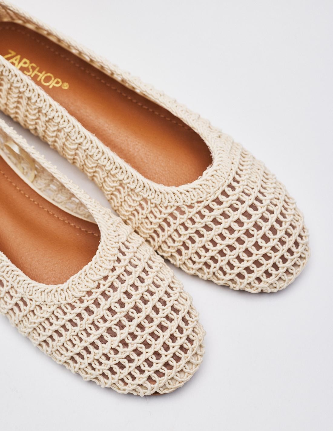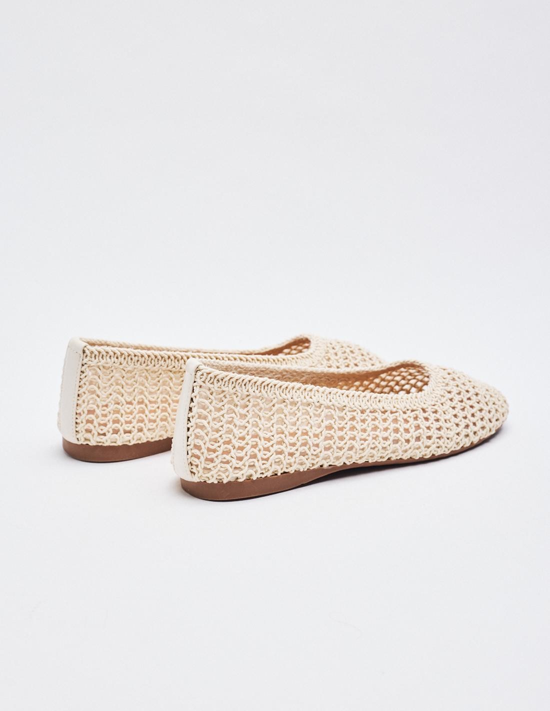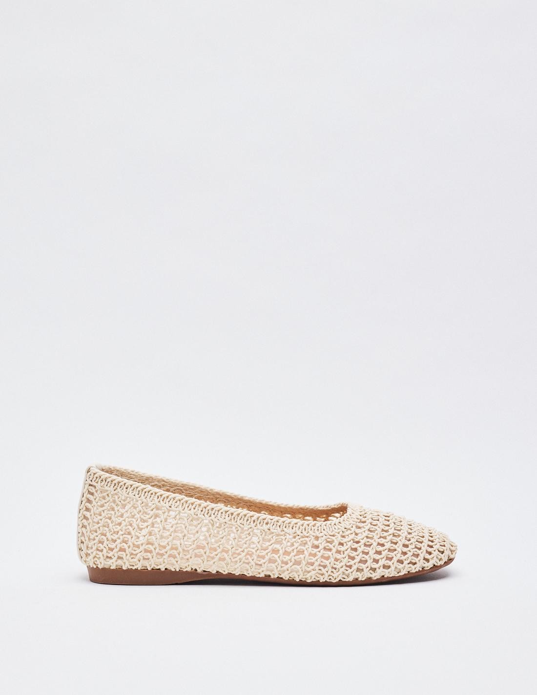 Zapato tipo bailarina con cuerpo trenzado. Acabado en punta redonda. Altura de la suela 1 cm