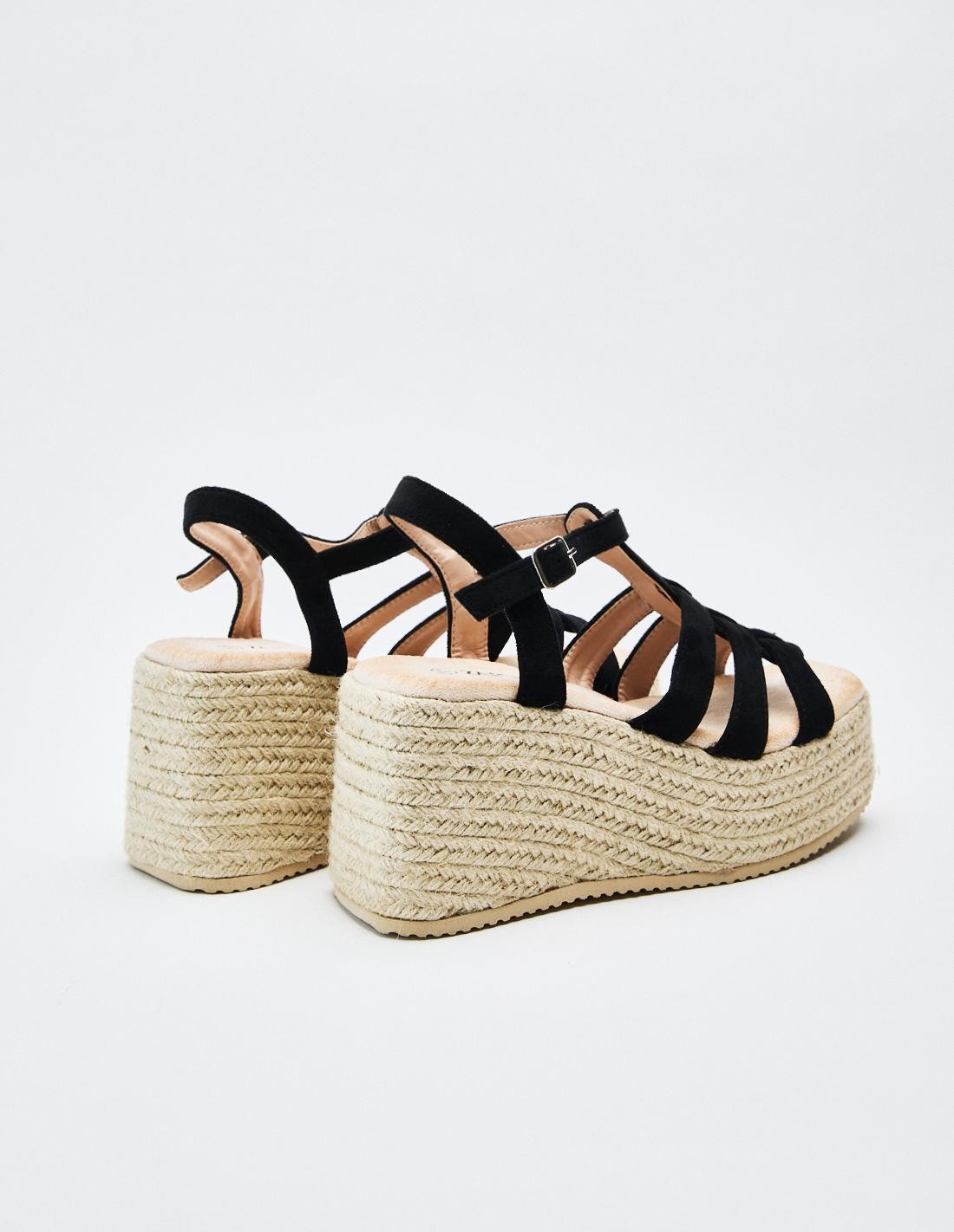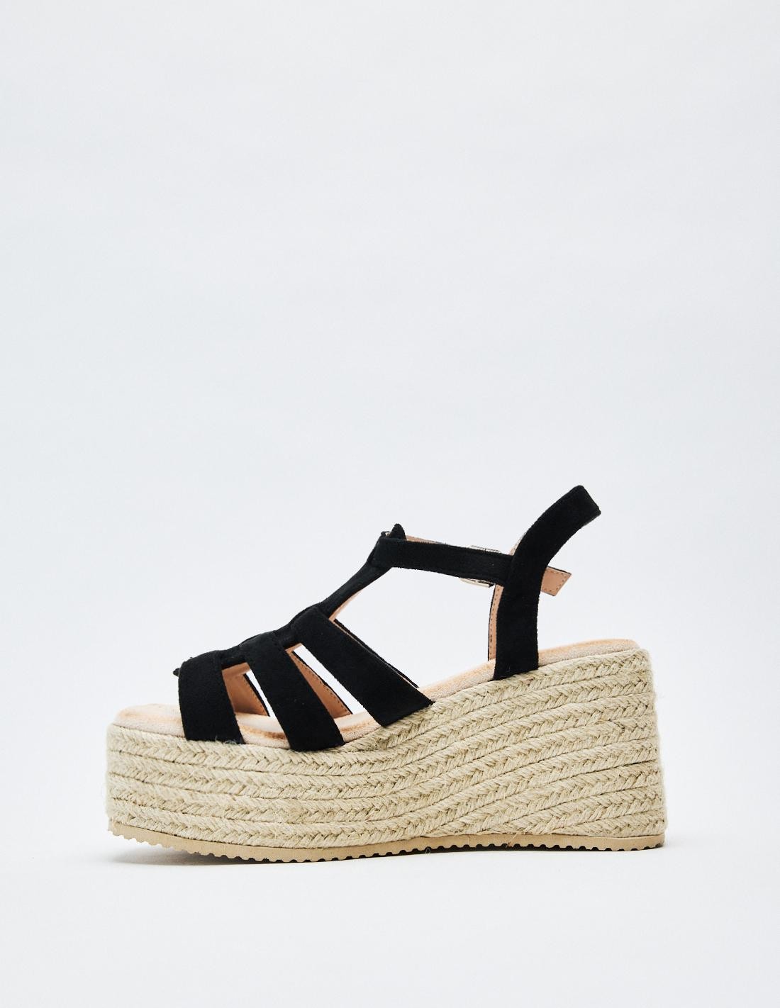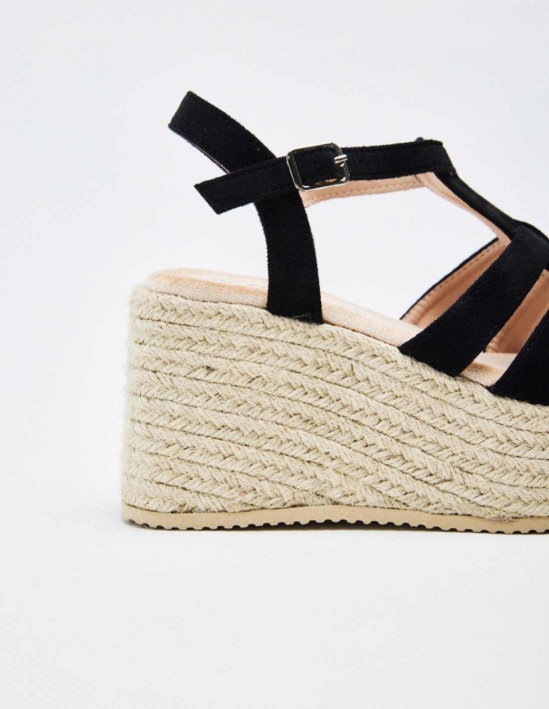 Zapato tipo sandalia con tacón en cuña y plataforma en combinación de materiales. Cierre mediante pulsera al tobillo. Acabado en punta redonda.