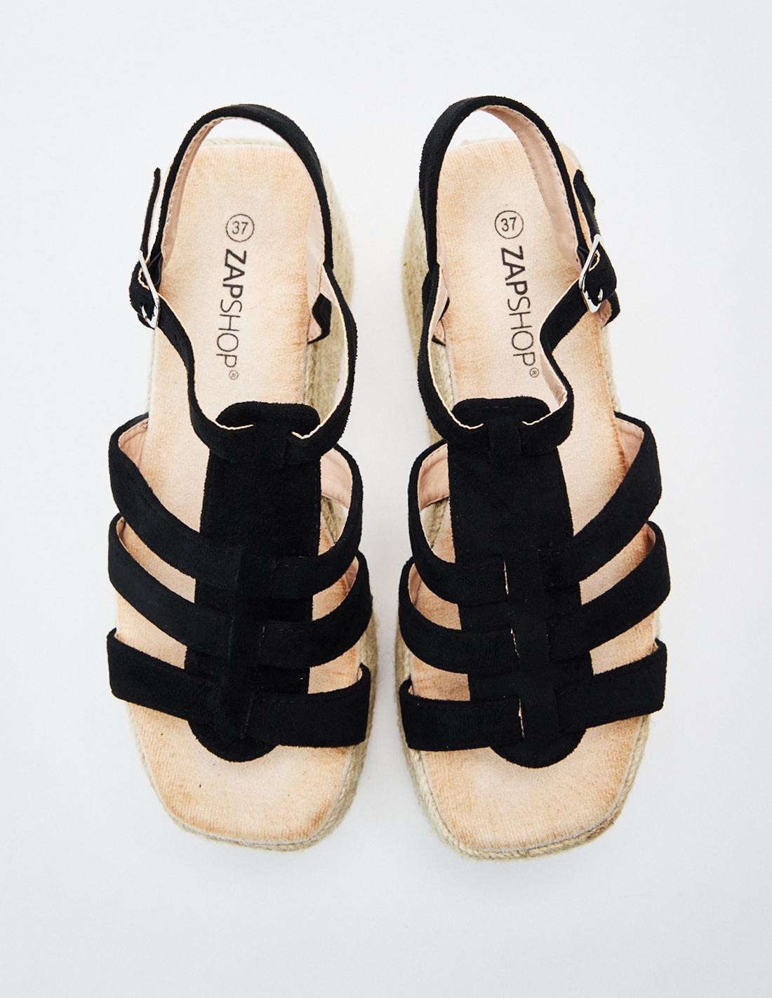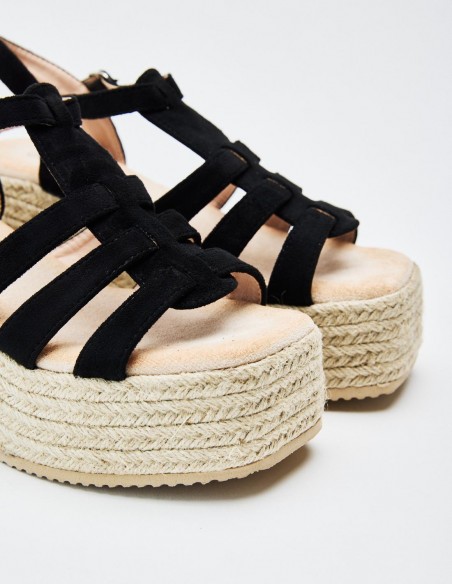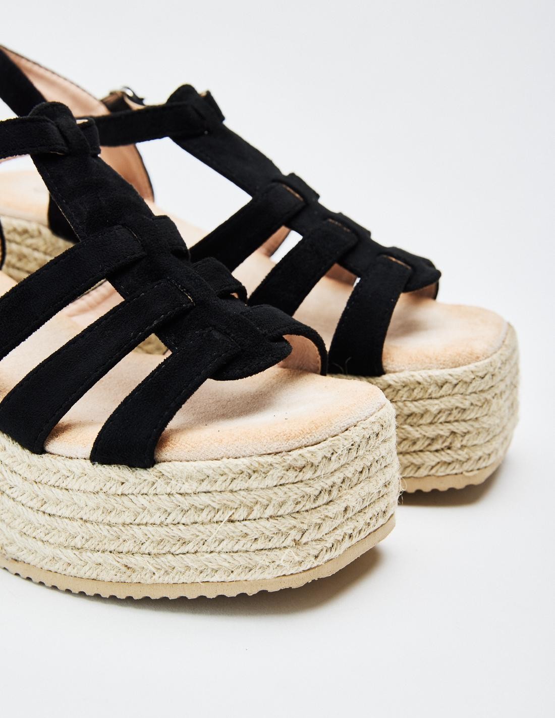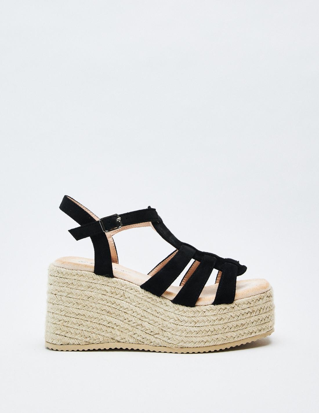 Zapato tipo sandalia con tacón en cuña y plataforma en combinación de materiales. Cierre mediante pulsera al tobillo. Acabado en punta redonda.