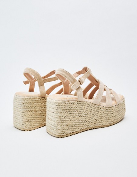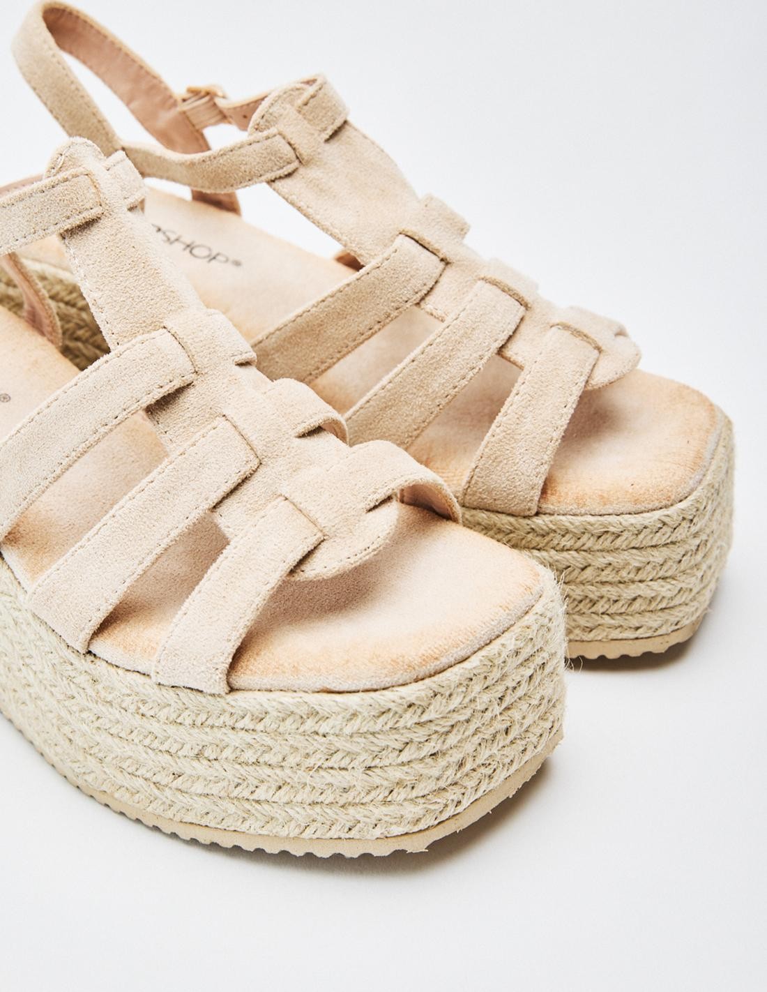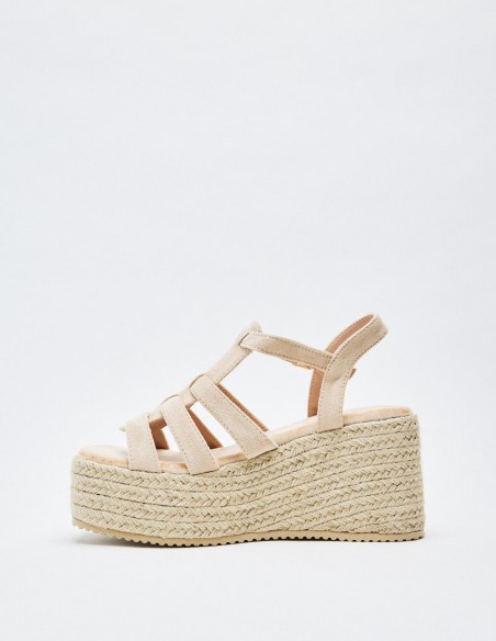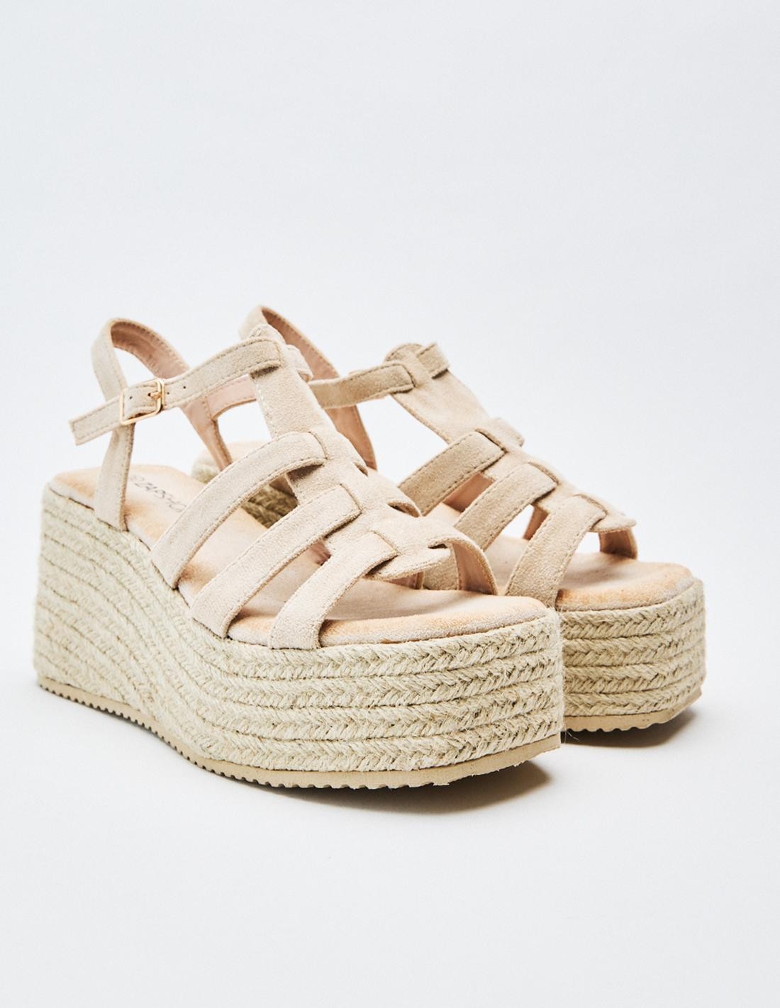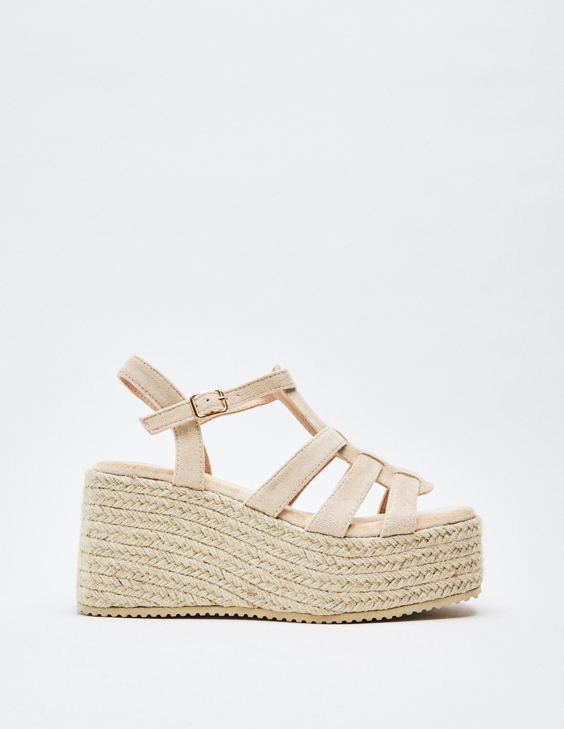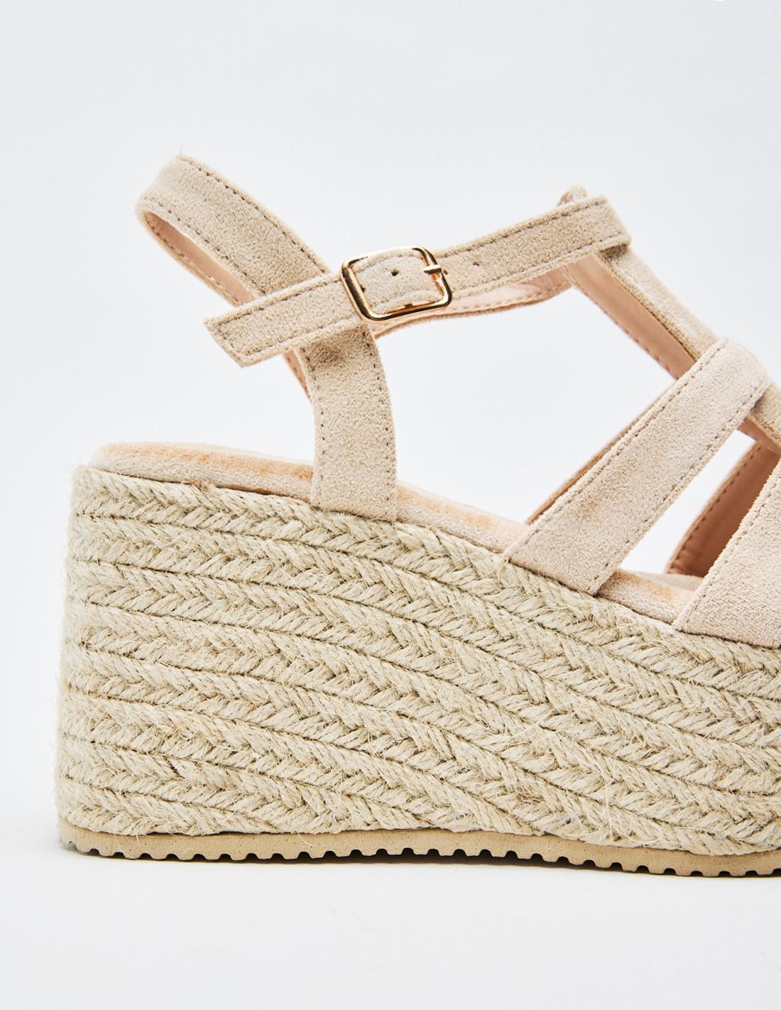 Zapato tipo sandalia con tacón en cuña y plataforma en combinación de materiales. Cierre mediante pulsera al tobillo. Acabado en punta redonda.