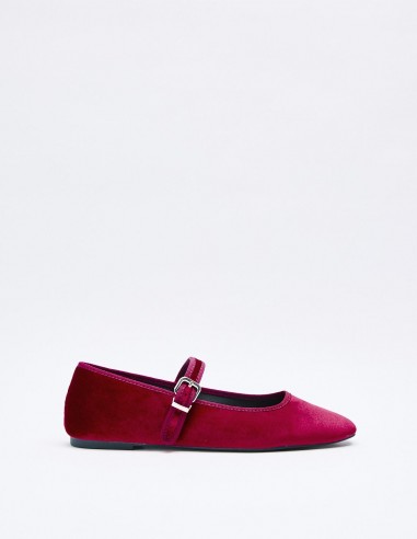 Zapato tipo bailarina en efecto terciopelo. Tira con hebilla en la parte delantera. Acabado en punta. Altura de la suela: 0,5 cm