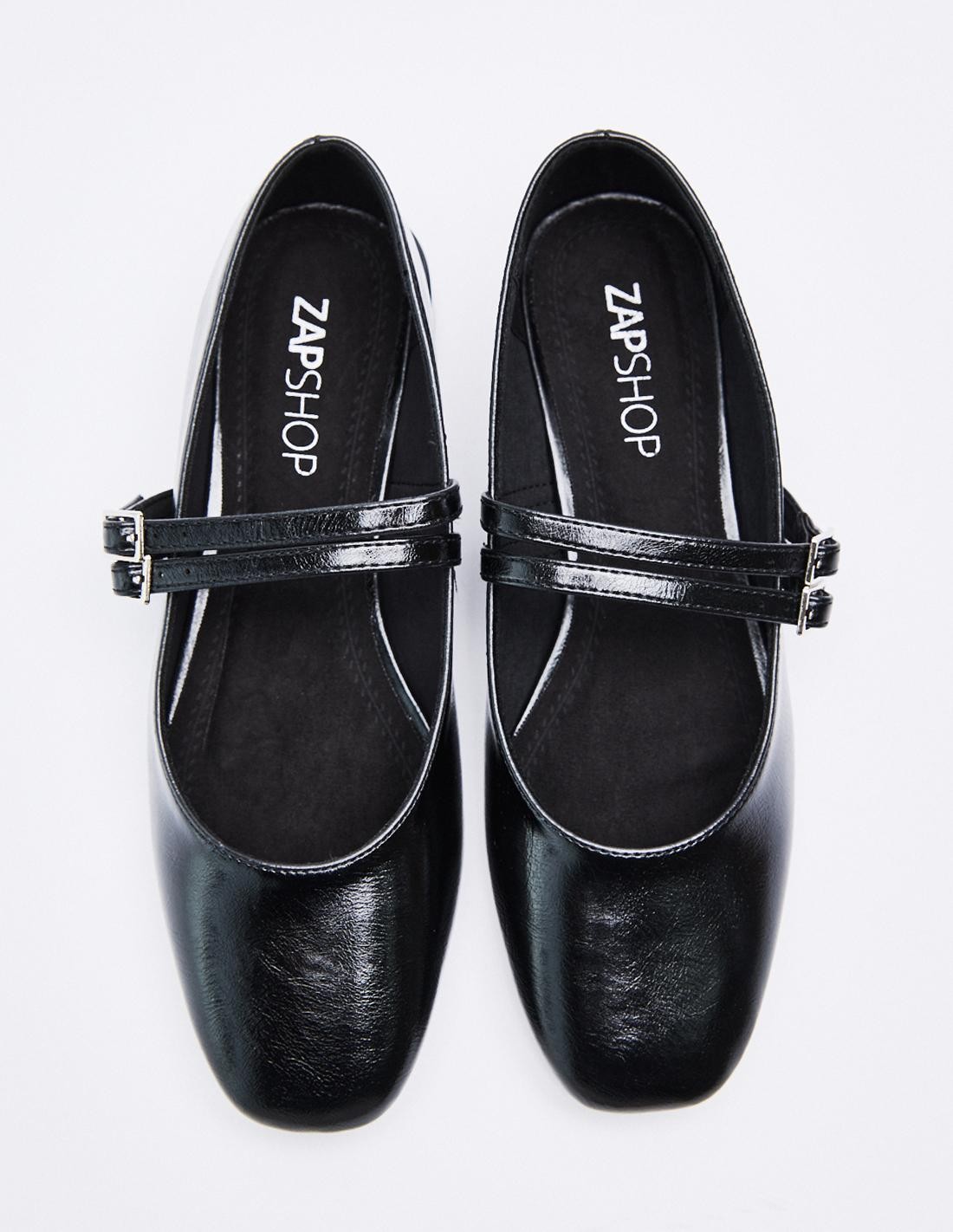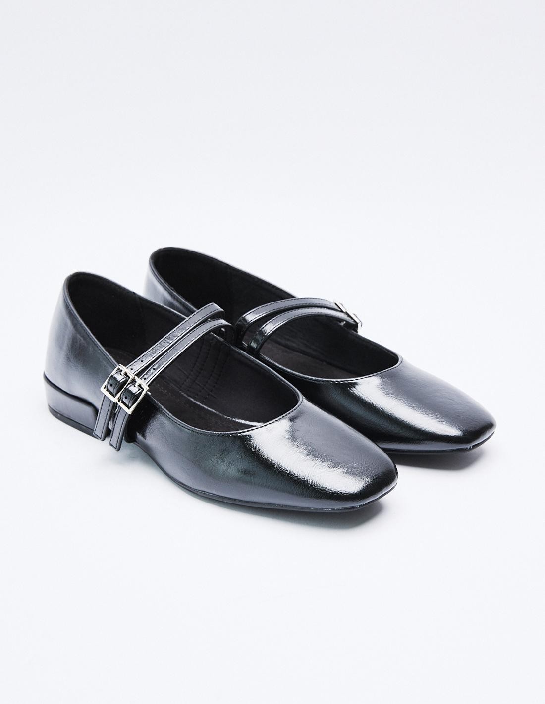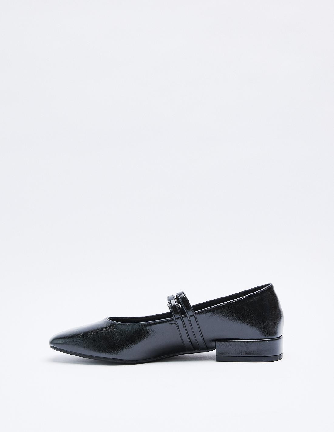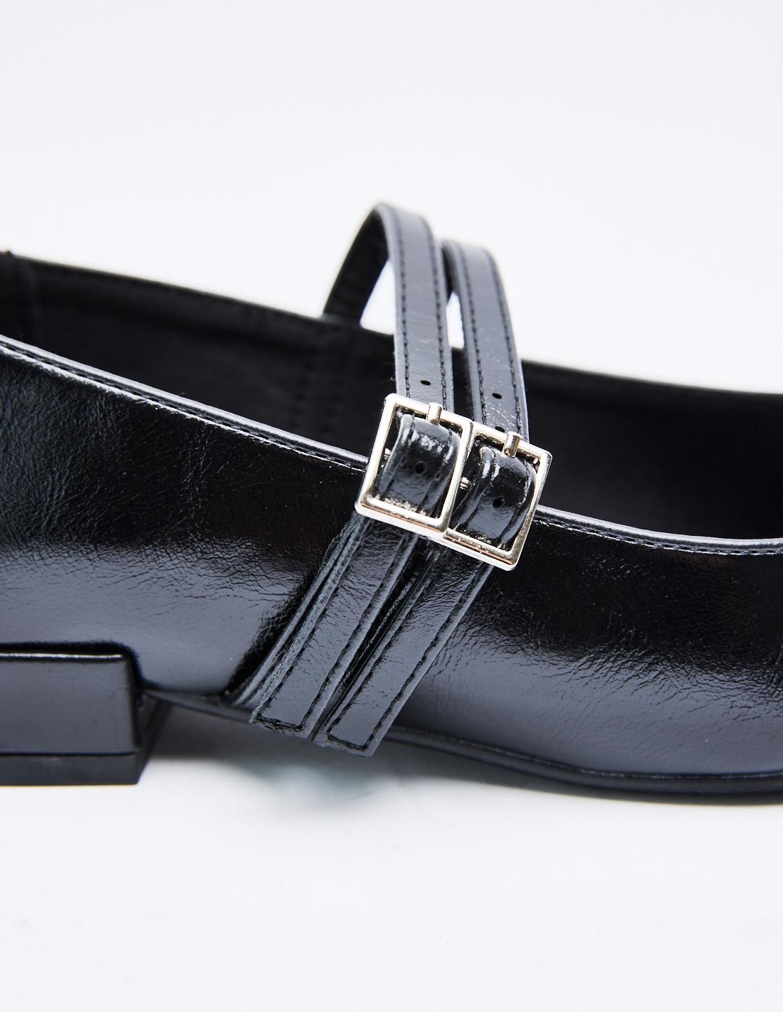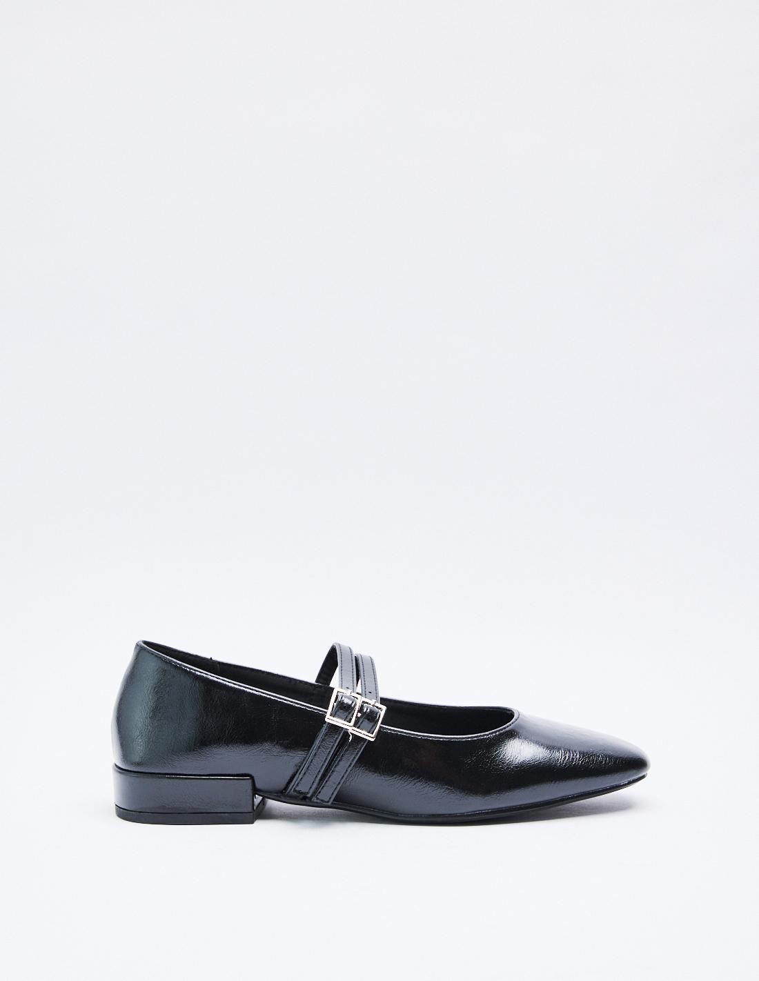 Zapato tipo bailarina efecto charol . Detalle de tiras finas con hebilla ajustable en el empeine.