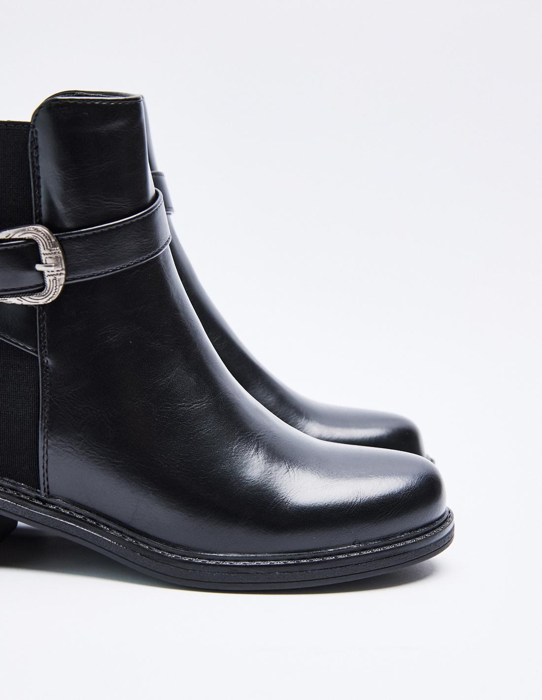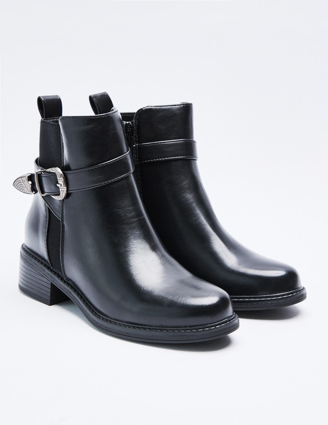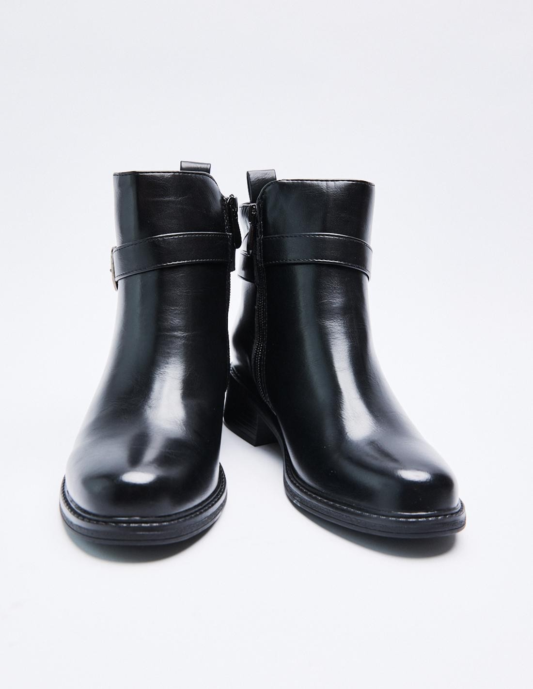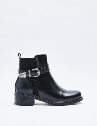 Zapato tipo botín efecto piel . Detalle metálico en la parte superiror del zapato. Punta redondeada. Cierre mediante cremallera en los laterales.