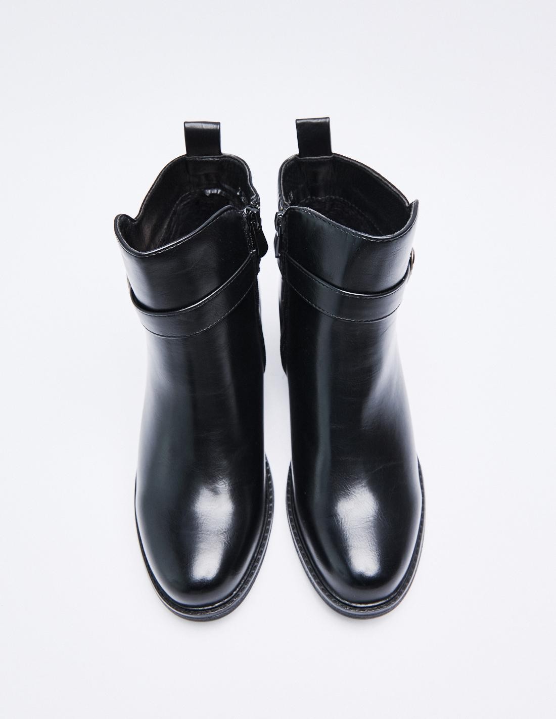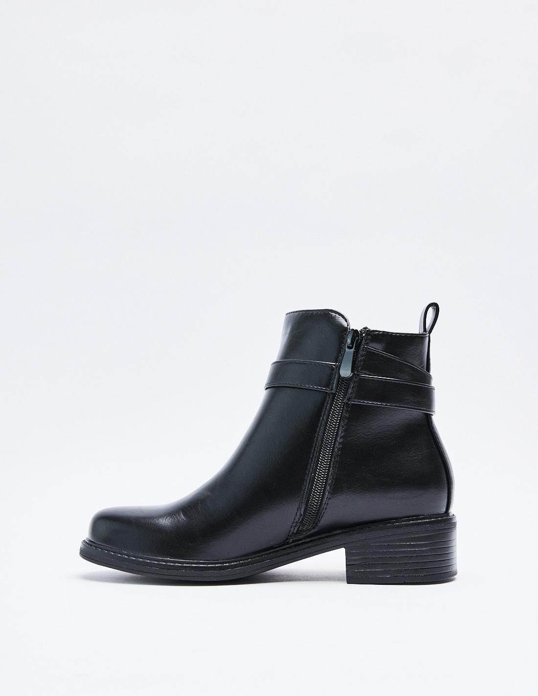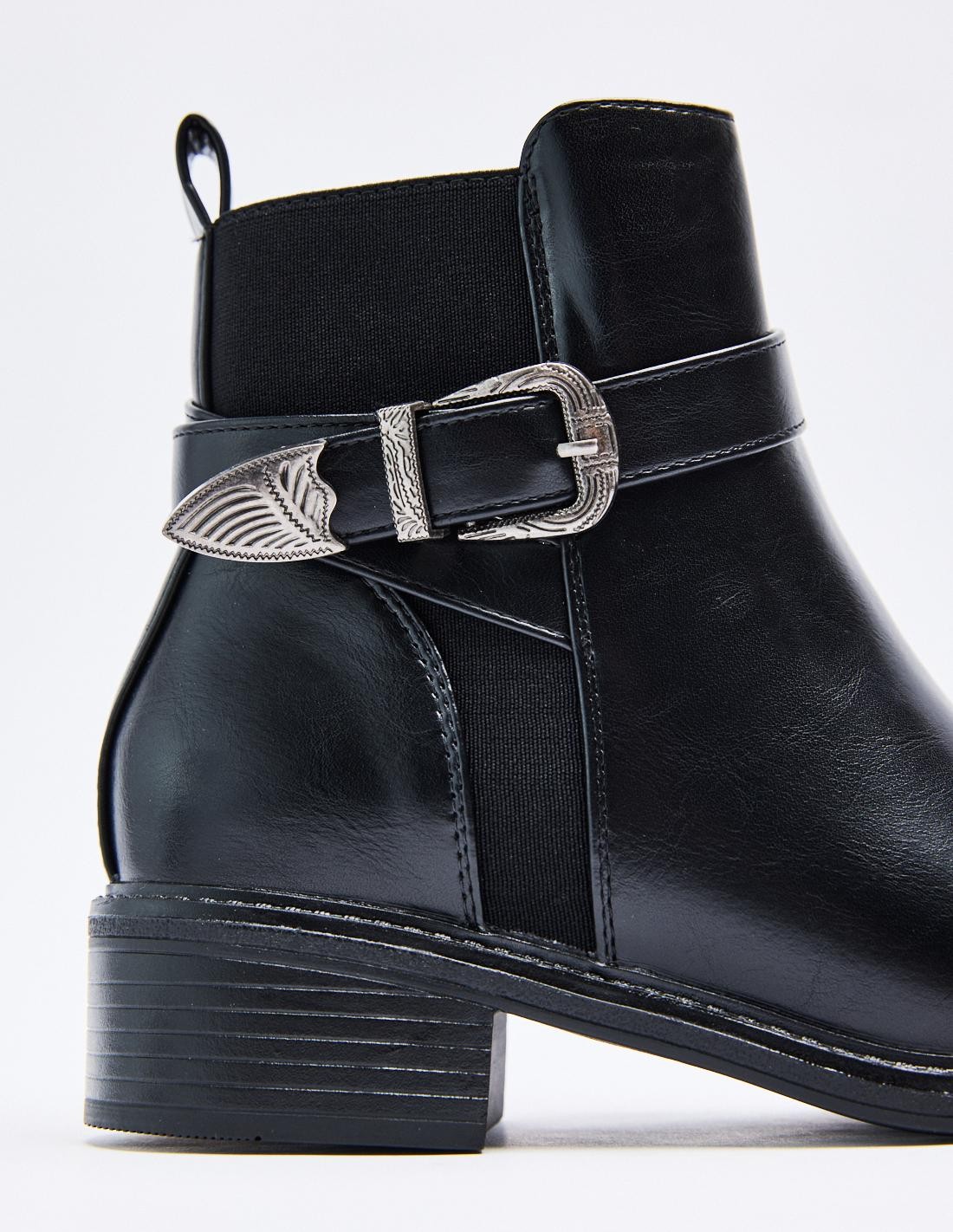 Zapato tipo botín efecto piel . Detalle metálico en la parte superiror del zapato. Punta redondeada. Cierre mediante cremallera en los laterales.