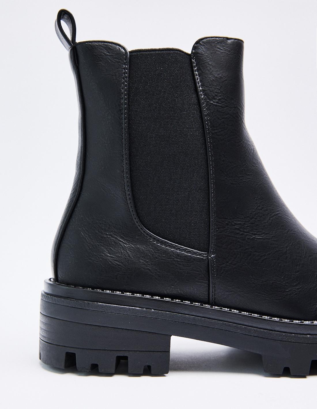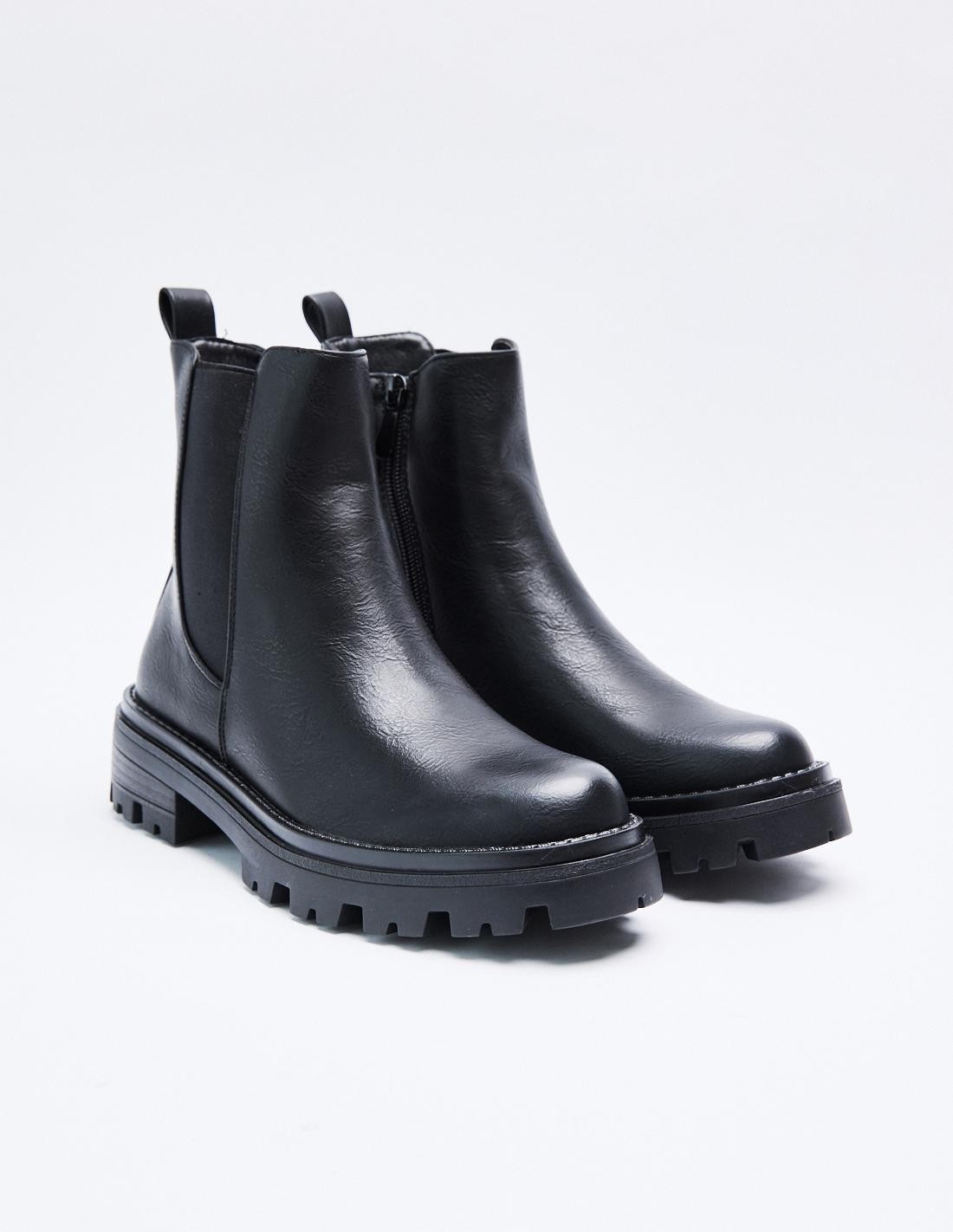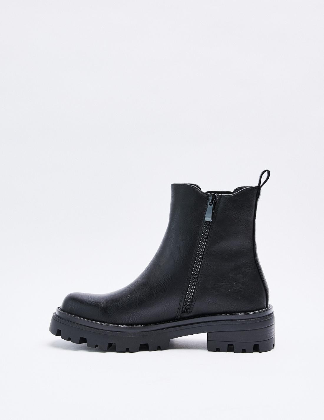 Zapato tipo botín efecto piel track .. Caña ajustada con paneles elásticos en los laterales. Punta redondeada. Cierre mediante cremallera en los laterales.