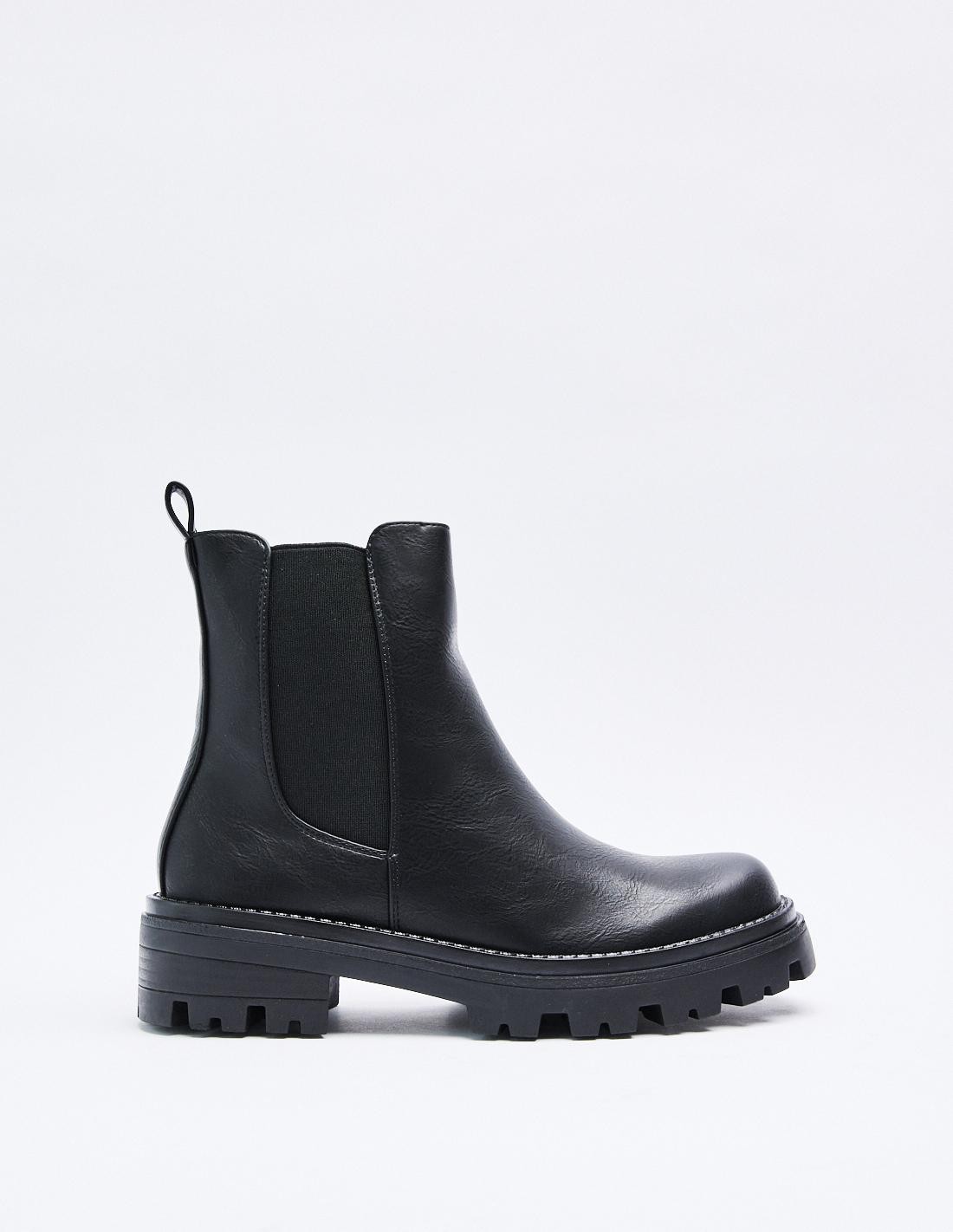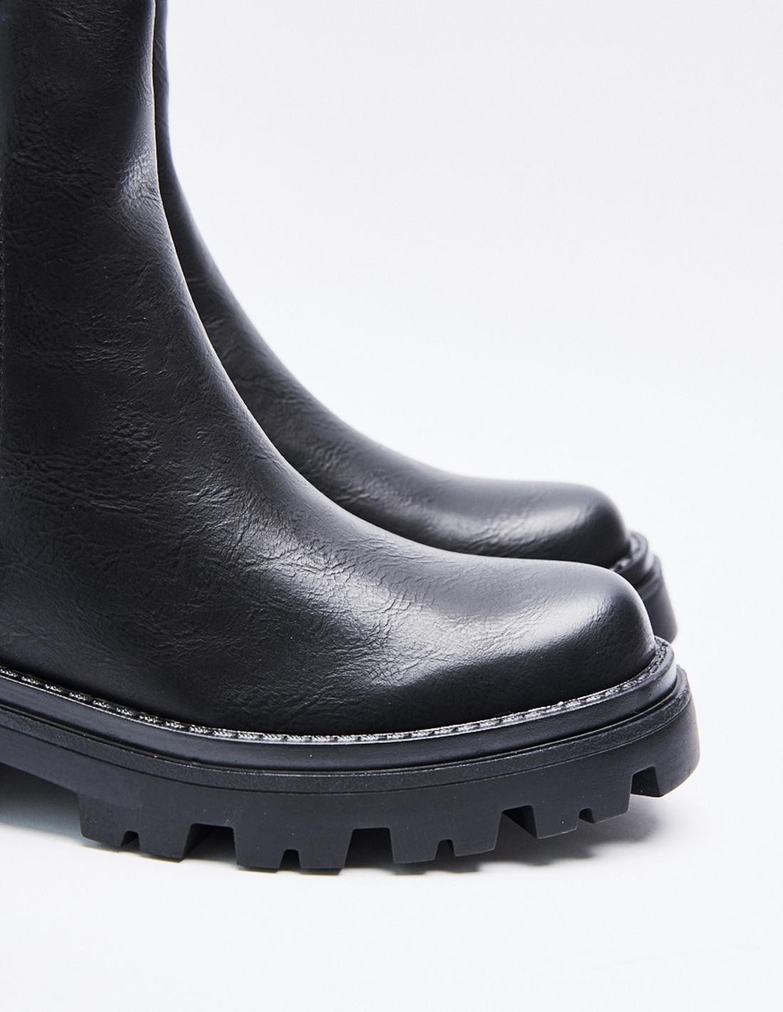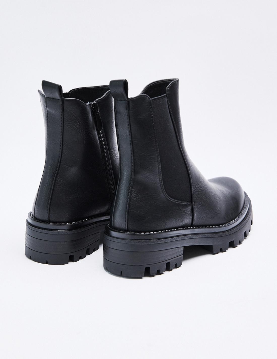 Zapato tipo botín efecto piel track .. Caña ajustada con paneles elásticos en los laterales. Punta redondeada. Cierre mediante cremallera en los laterales.