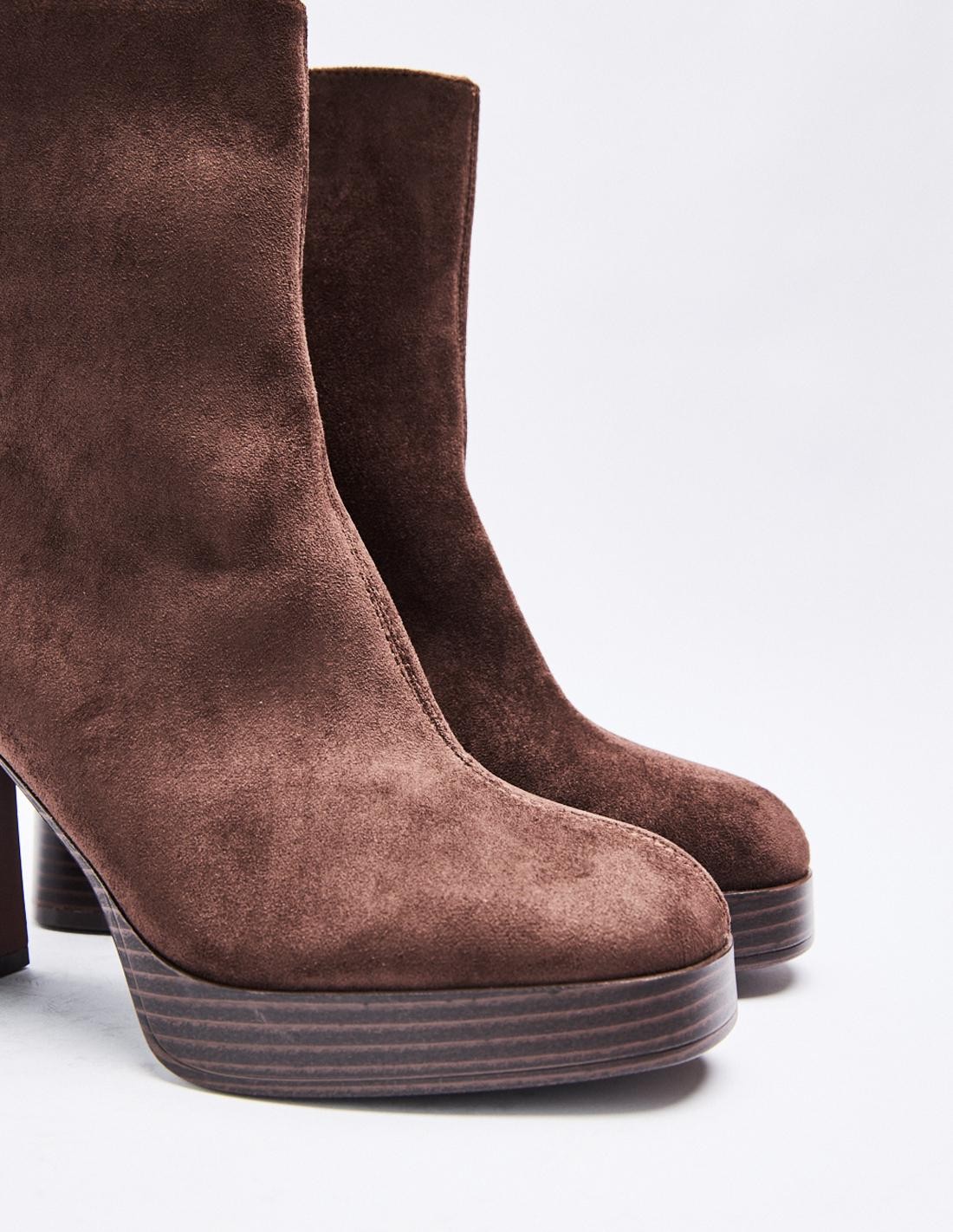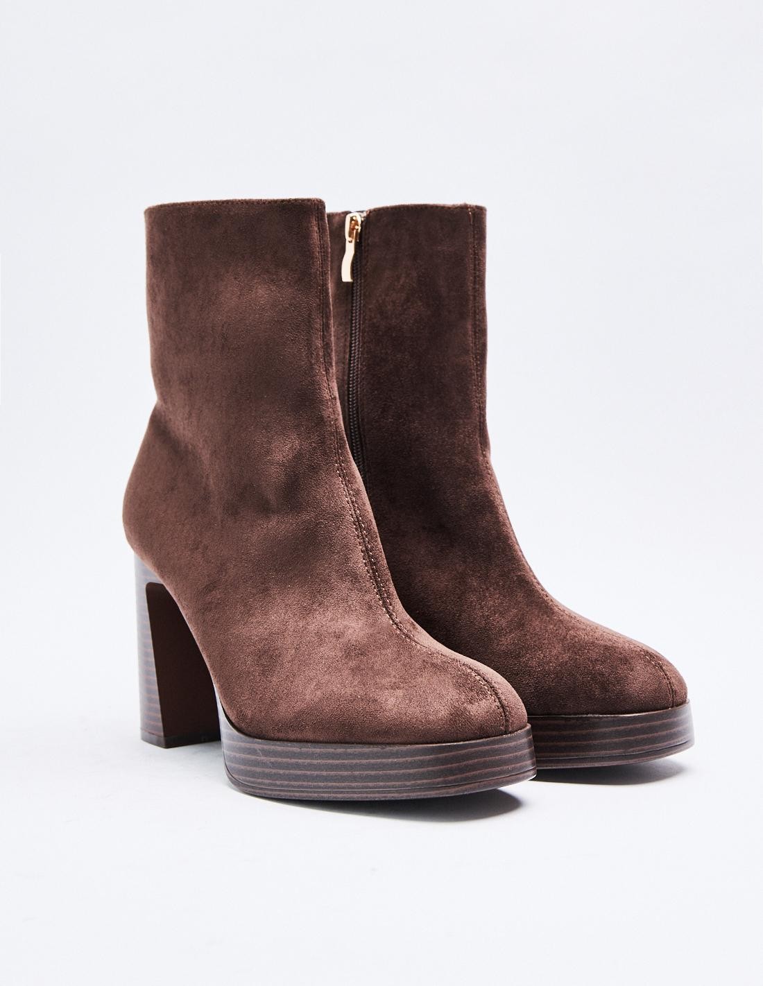 Zapato tipo botín. efecto serraje . Calce fácil mediante pull on. Tacón alto en bloque. Acabado en punta redonda. Cierre mediante cremallera en los laterales Altura del tacón: 11 cm
