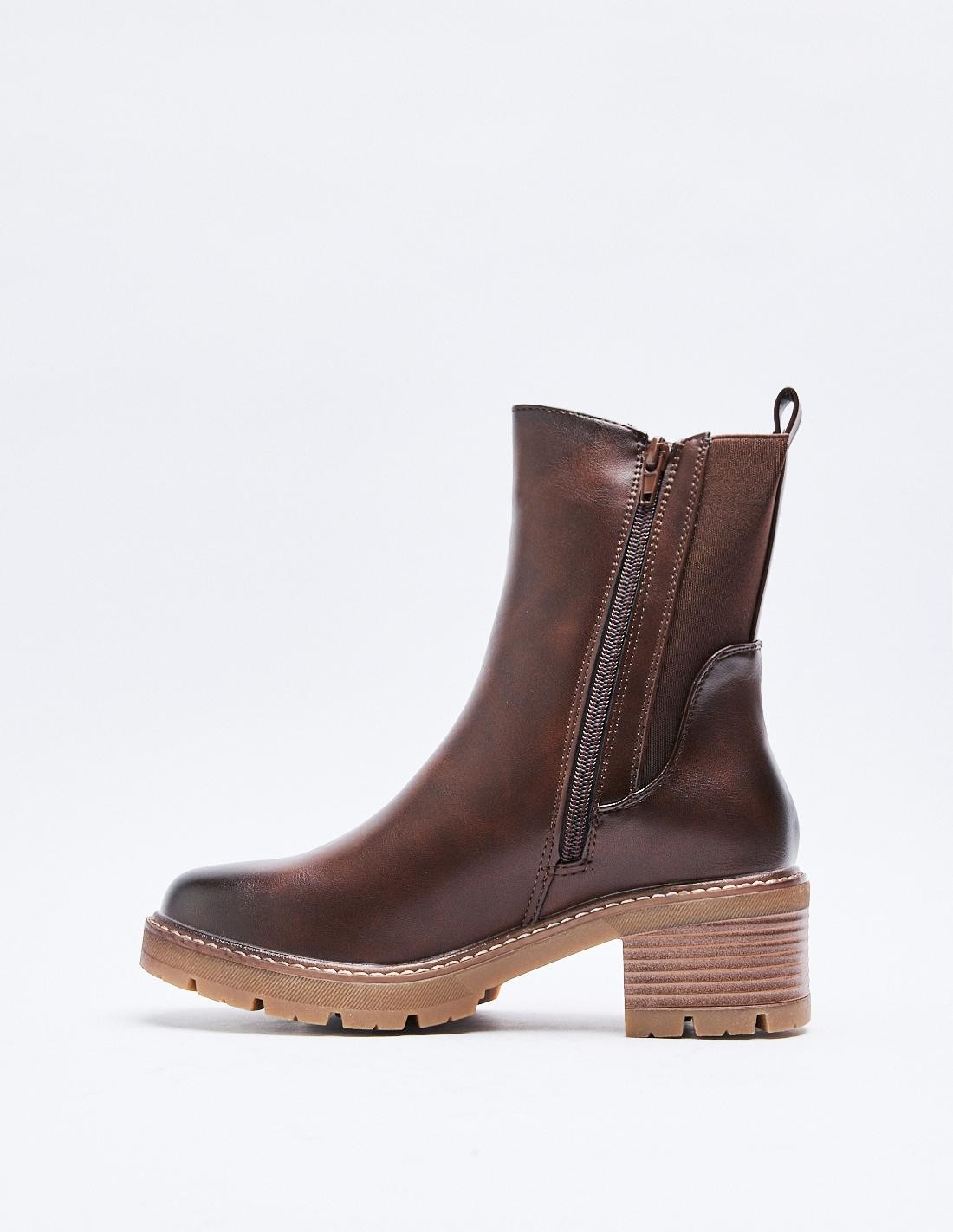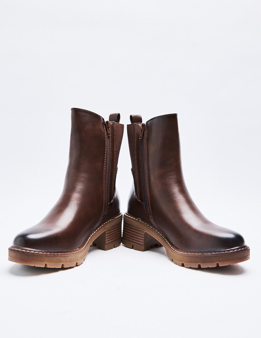 Zapato tipo botín efecto piel track .. Caña ajustada con paneles elásticos en los laterales. Punta redondeada. Cierre mediante cremallera en los laterales.