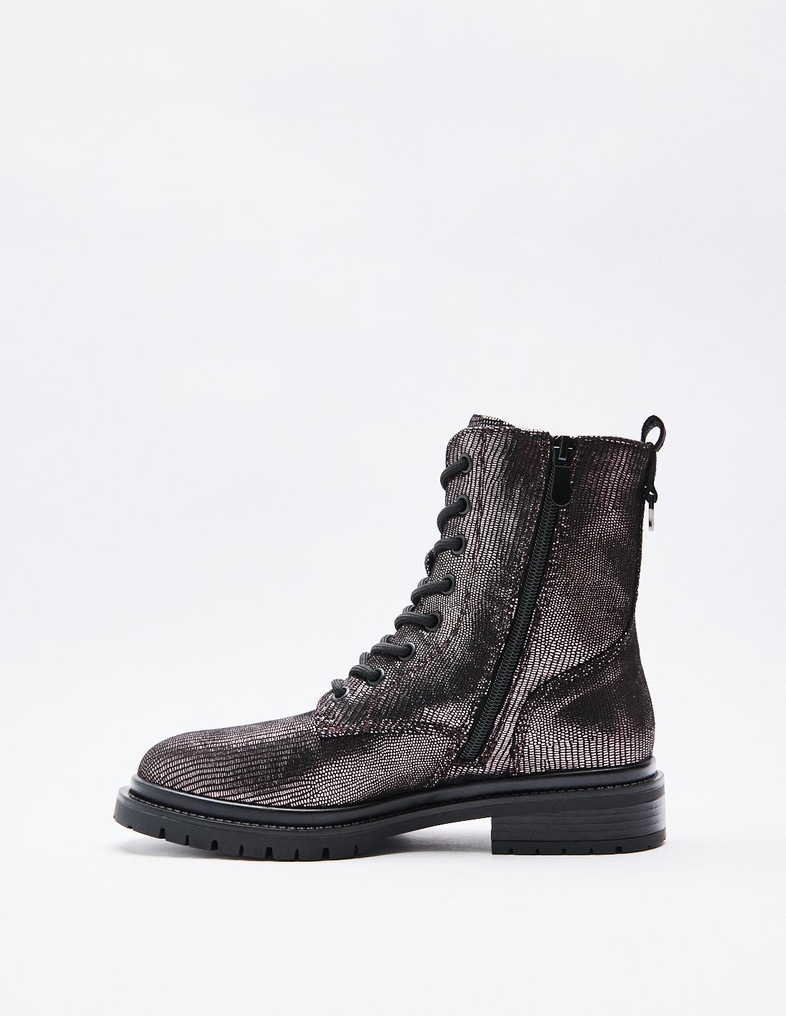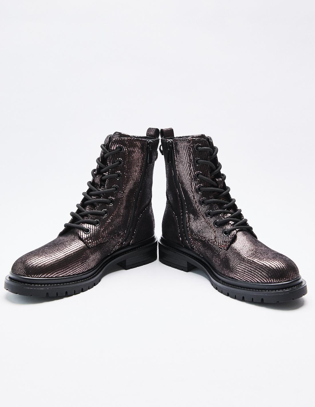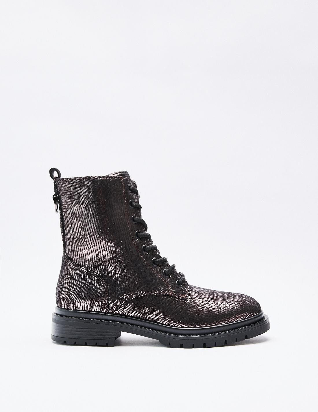 Zapato tipo botín en efecto brillante. Suela plana.Tirador trasero. Cierre mediante cordones y cremallera lateral. Acabado en punta redonda.