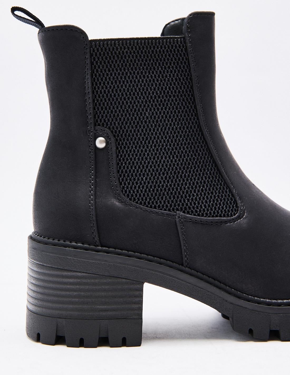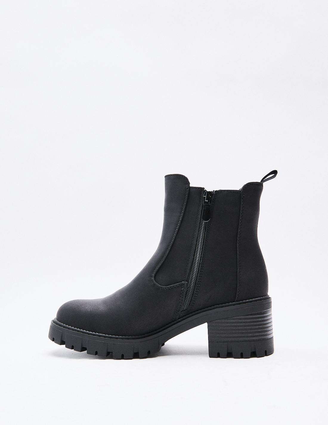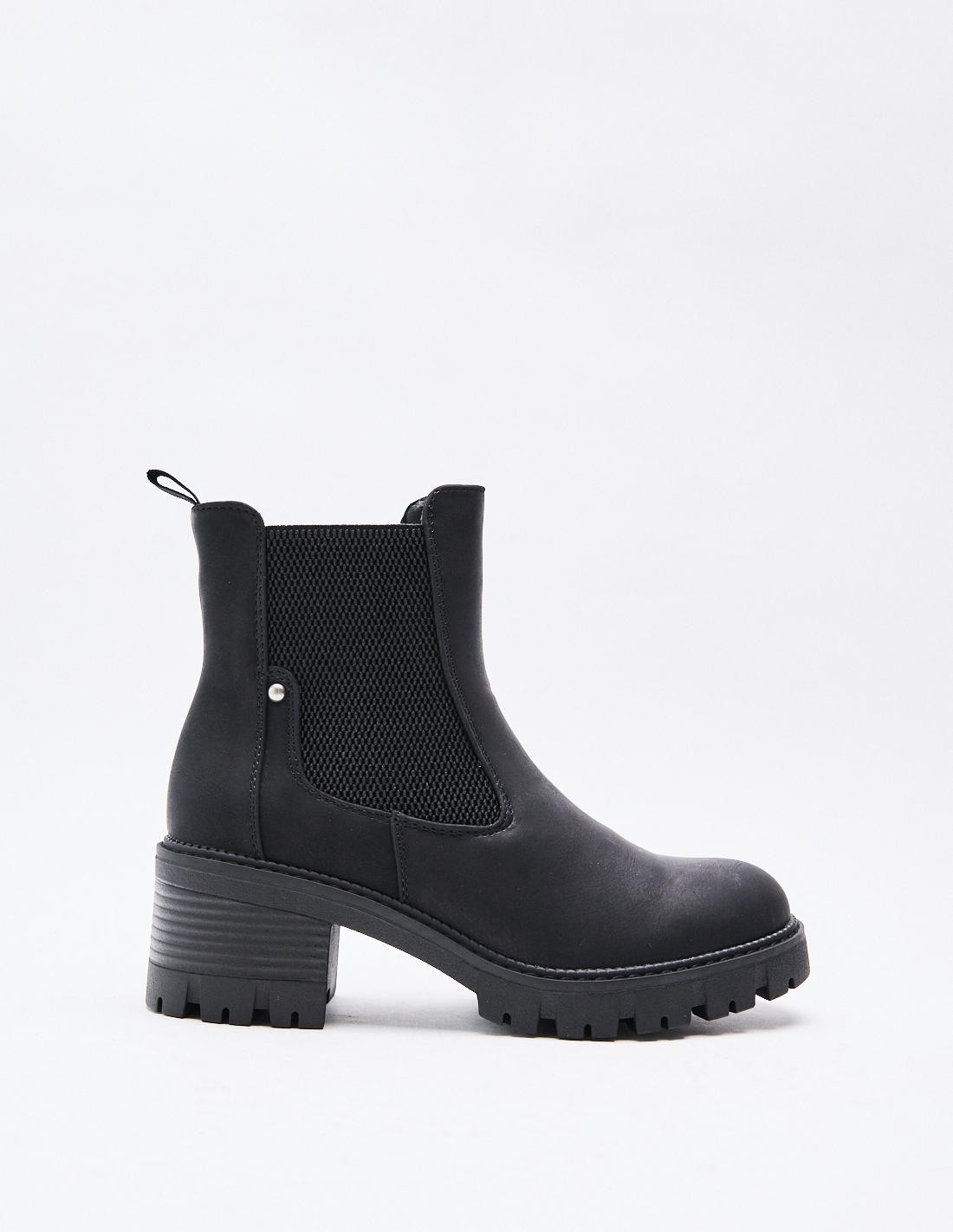 Zapato tipo botín efecto track .. Caña ajustada con paneles elásticos en los laterales. Punta redondeada. Cierre mediante cremallera en los laterales. Altura tacón : 6 CM