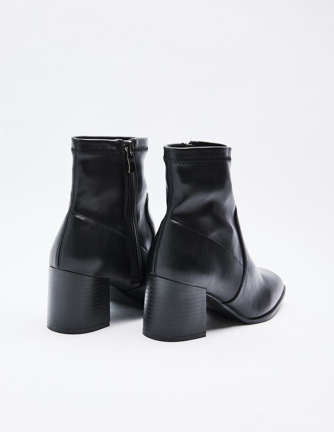 Zapato tipo botín con tacón. Detalle de pespunte en el corte. Cierre mediante cremallera lateral. Tacón alto en bloque. Acabado en punta. Altura de la suela: 6,5 cm