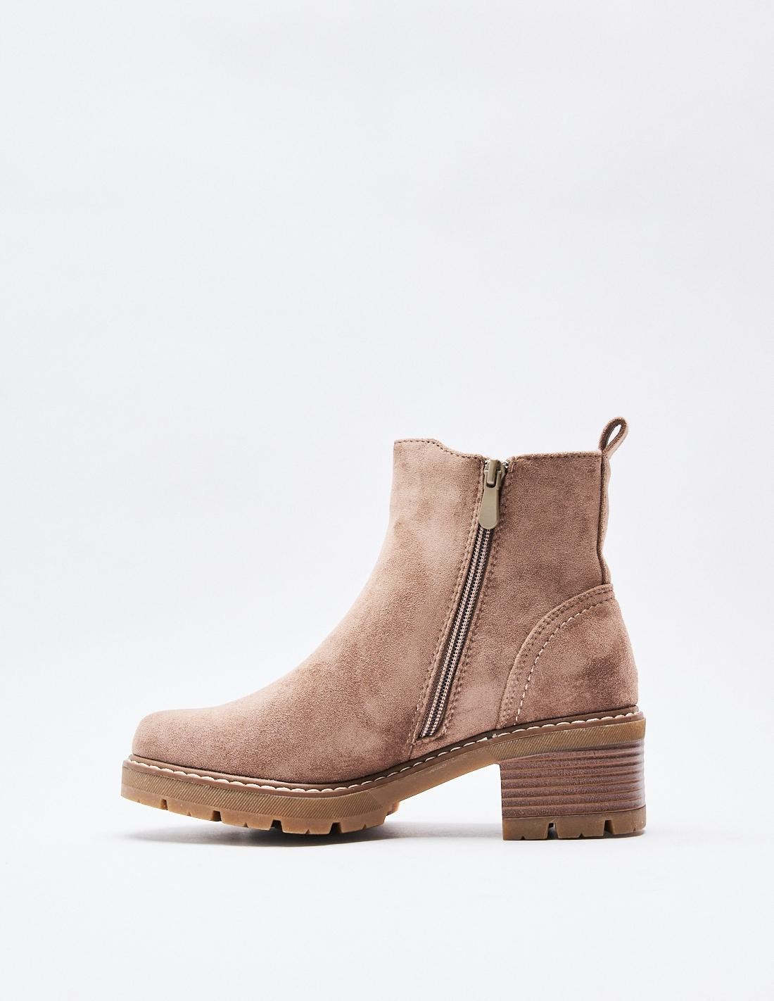 Zapato de tacón tipo botín en serraje. Acabado en punta redonda. Tiradores en la parte trasera. Cierre mediante cremallera en el lateral.