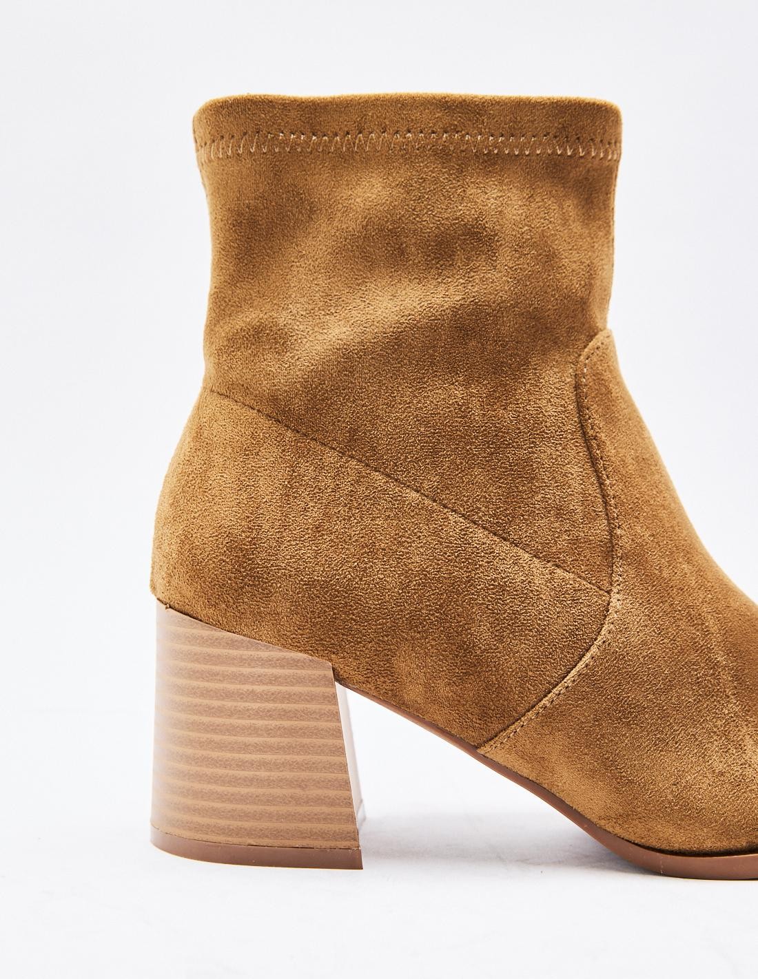 Zapato tipo botín con tacón. Detalle de pespunte en el corte. Cierre mediante cremallera lateral. Tacón alto en bloque. Acabado en punta. Altura de la suela: 6,5 cm