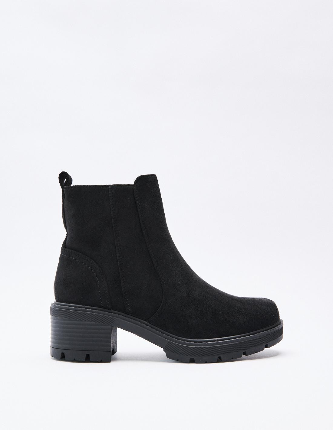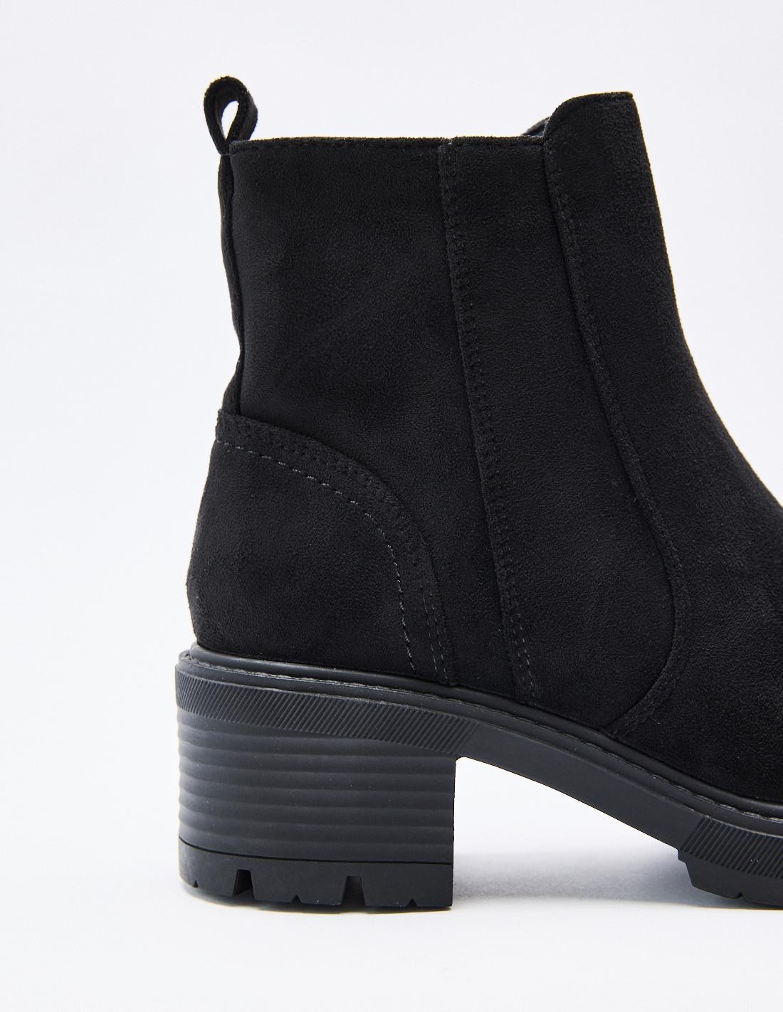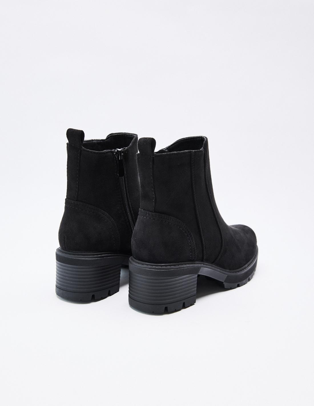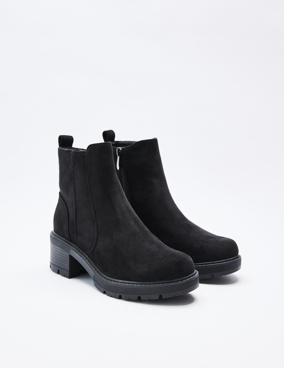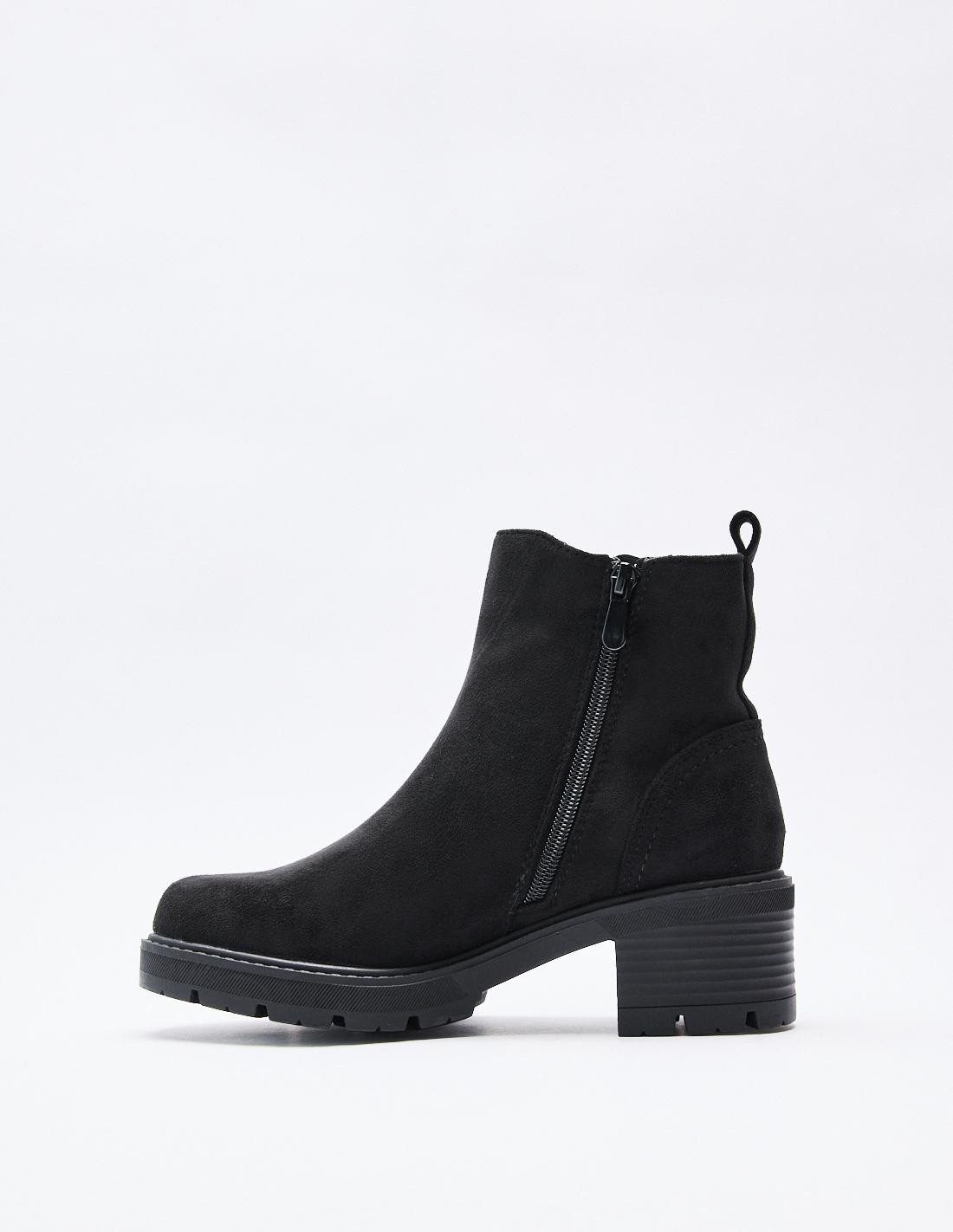 Zapato de tacón tipo botín en serraje. Acabado en punta redonda. Tiradores en la parte trasera. Cierre mediante cremallera en el lateral. Altura del tacón: 4,4 cm.