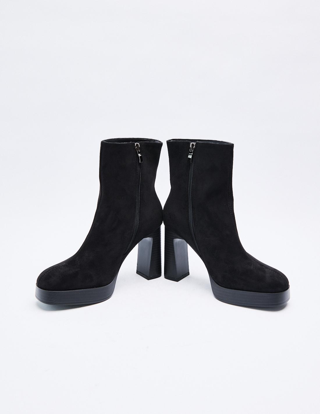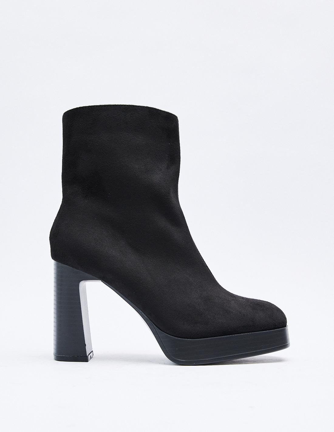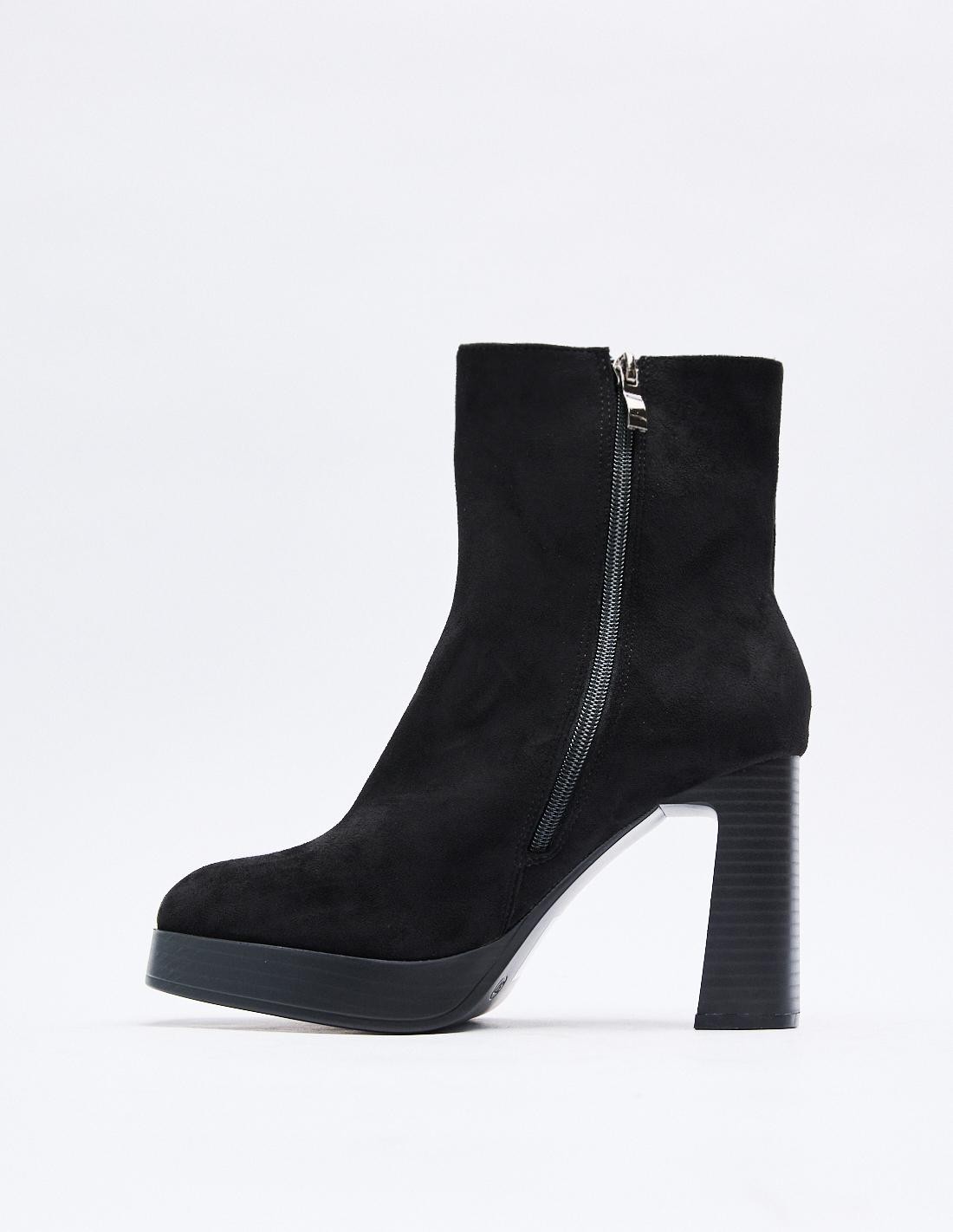 Zapato tipo botín. efecto serraje . Calce fácil mediante pull on. Tacón alto en bloque. Acabado en punta redonda. Cierre mediante cremallera en los laterales Altura del tacón: 11 cm