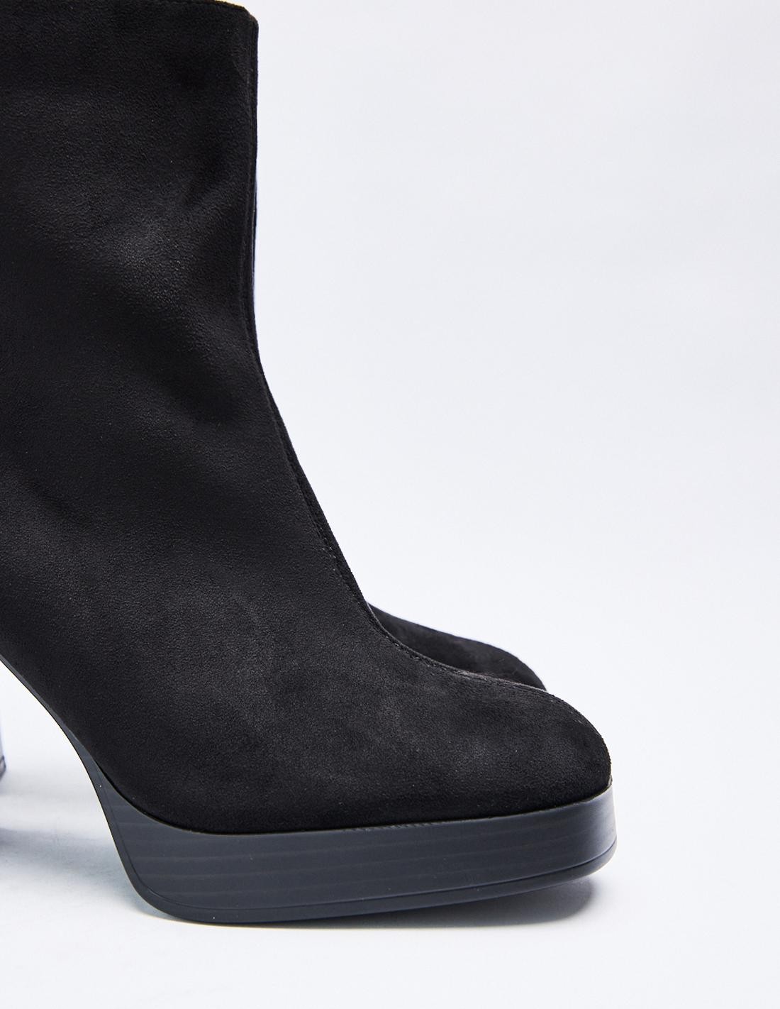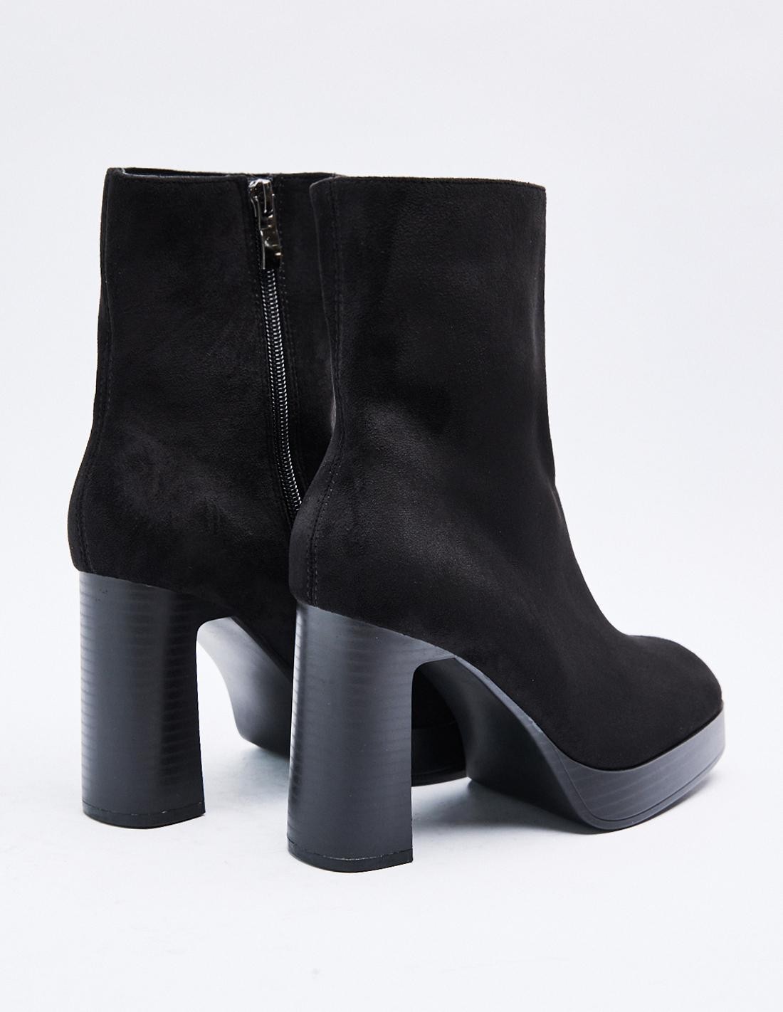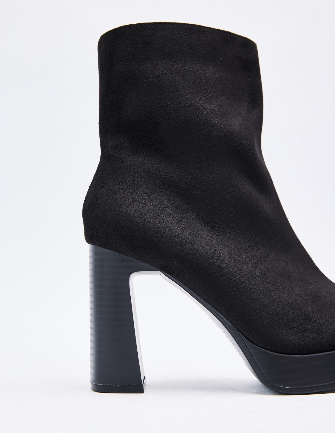 Zapato tipo botín. efecto serraje . Calce fácil mediante pull on. Tacón alto en bloque. Acabado en punta redonda. Cierre mediante cremallera en los laterales Altura del tacón: 11 cm